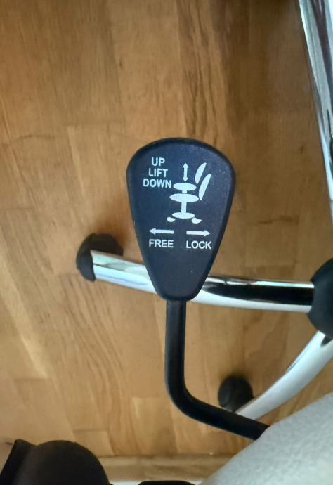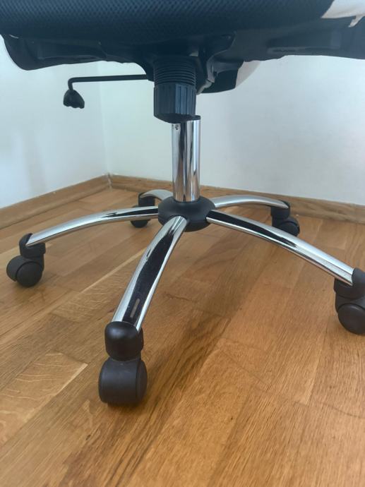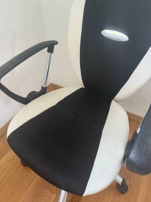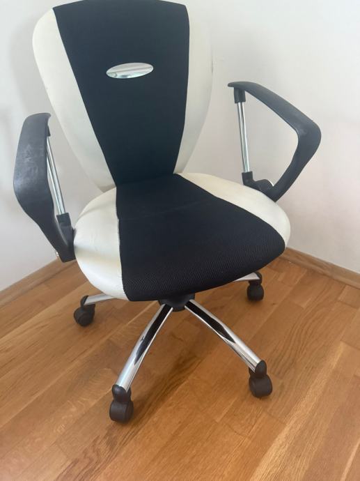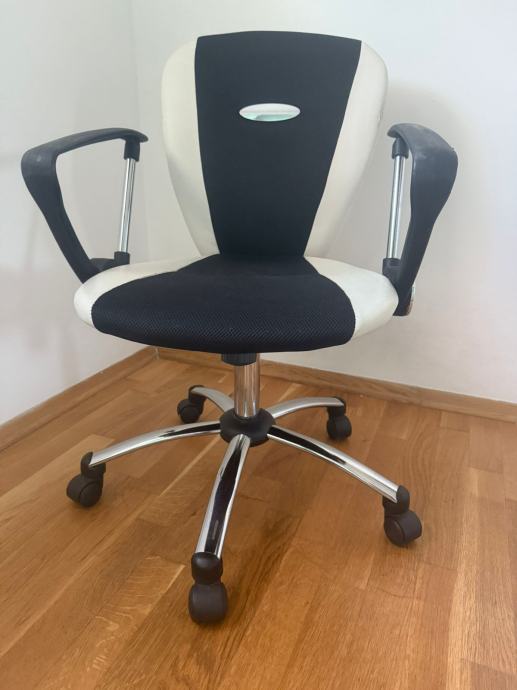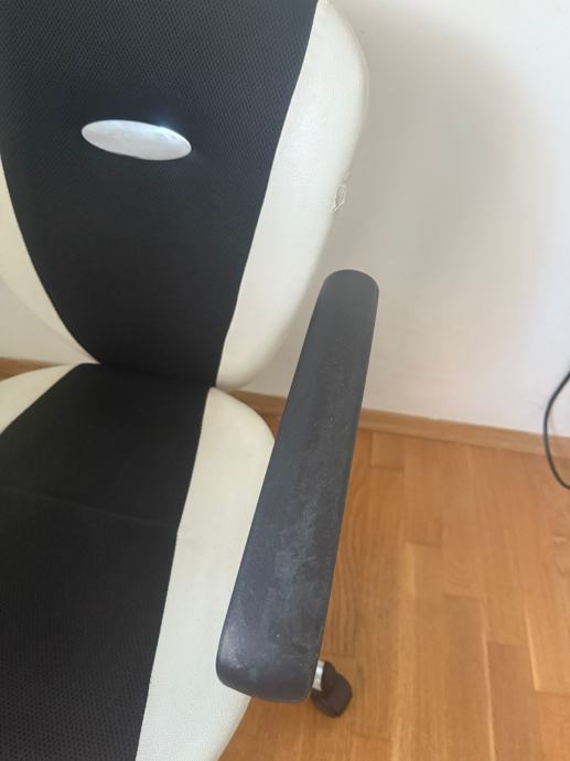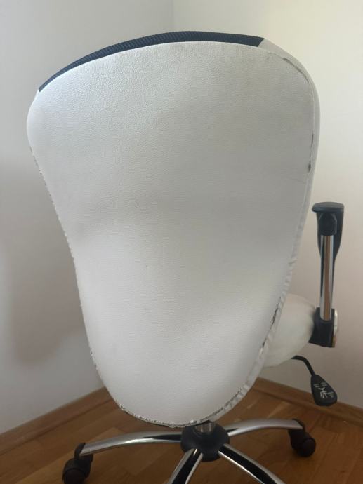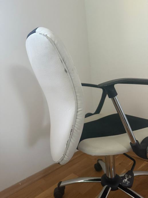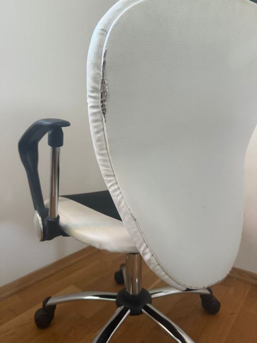 U potpuno ispravnom stanju.Podesiva visina,a naslon stolice moze biti fiksiran,a moze se staviti u polozaj za ljuljanje.Na stolici su minimalna ostecenja i to samo na djelu gdje je kozni dio.Vidljivo na slikama.