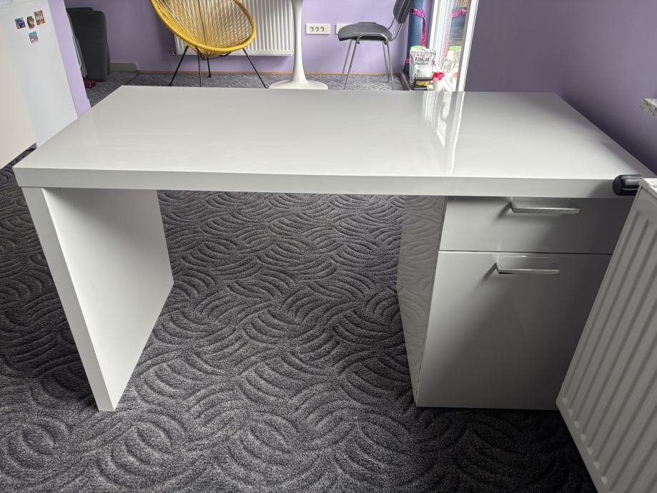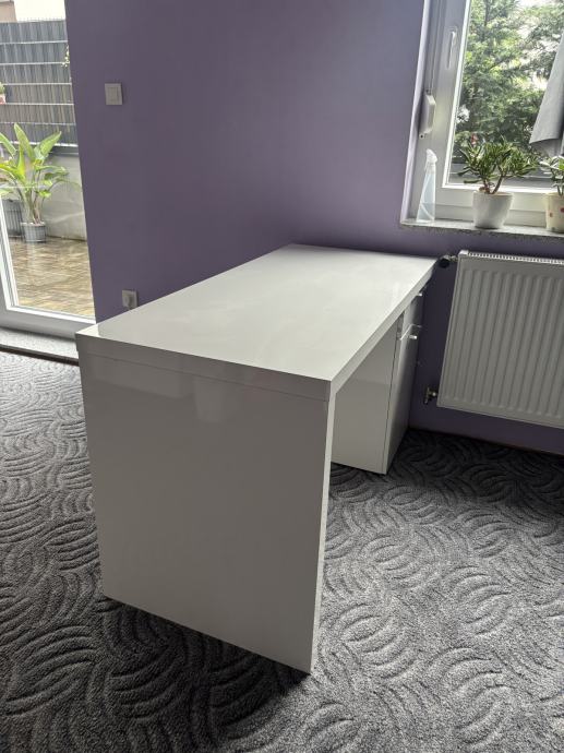 Xora uredski stol s ugrađenim ladičarom u bijeloj boji visokog sjaja: Kratko vrijeme korišten u uredu, jako dobro usčuvan, kupljen u Lesnini. Dimenzije proizvoda: 130x75x60 cm. (Pojedinačna cijena: 150 eur)
