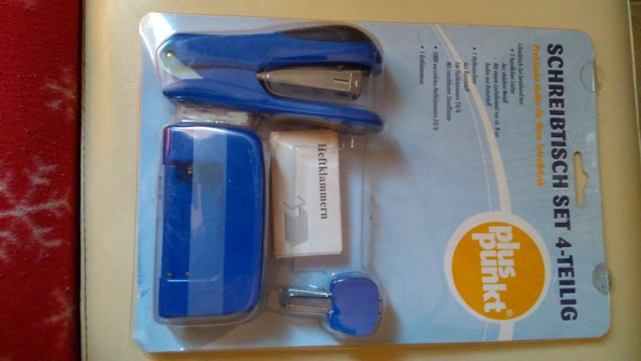 4- dijelni pribor u originalnom pakiranju, nekorišten, novi. Klamerice, aparat za klamanje,bušilica za papir.