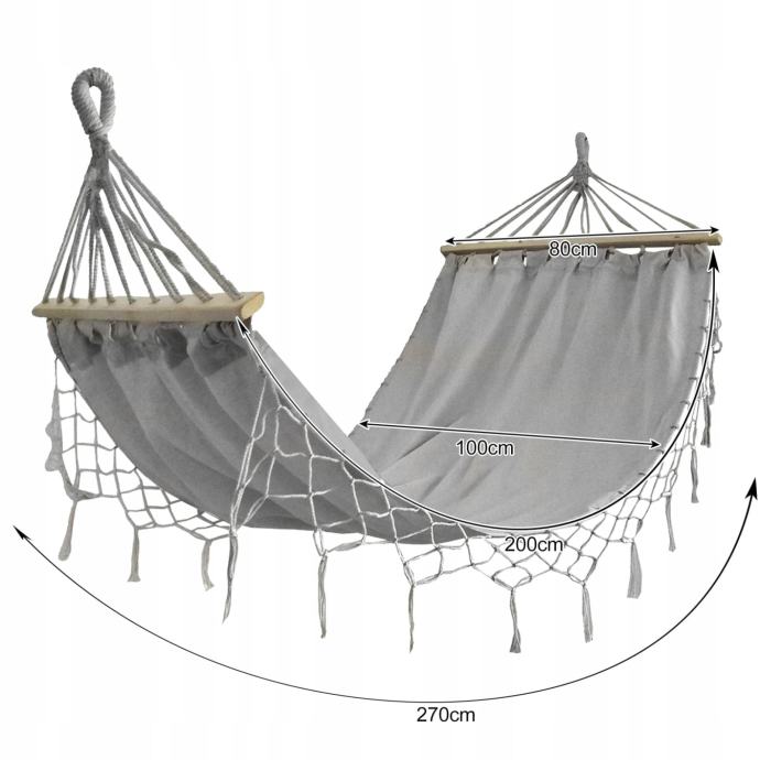 Pripremite se za savršen kutak za opuštanje u svom vrtu ili terasi s velikom vrtnom visećom mrežom od 200x100 cm, koja može izdržati do 200 kg. Ova elegantna siva viseća mreža dizajnirana je za udobnost i izdržljivost, a omogućava vam da se potpuno opustite i uživate u trenucima mira i spokojnosti. Napravljen od visokokvalitetnih pamučnih platna i jakih konopa, pruža optimalnu podršku i udobnost. Hammock je prikladan za jednu osobu, ali zbog svoje veličine dovoljno je prostran za dvije osobe, što omogućava zajedničko uživanje u opuštajućem odmoru.