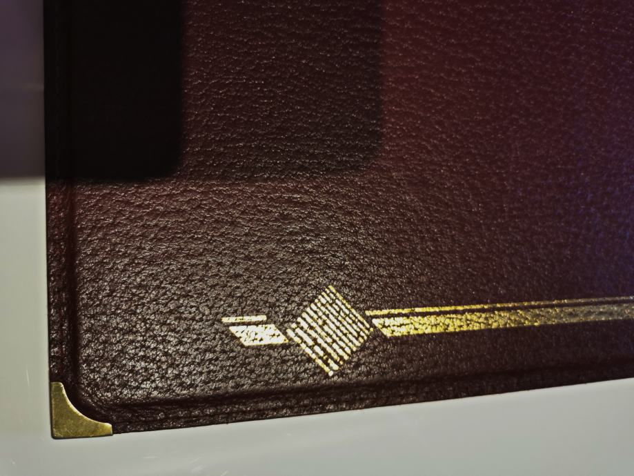 Na krajevima zlatni metalni limići, kutnici. Koža je čvrsta, prava, kvalitetna.