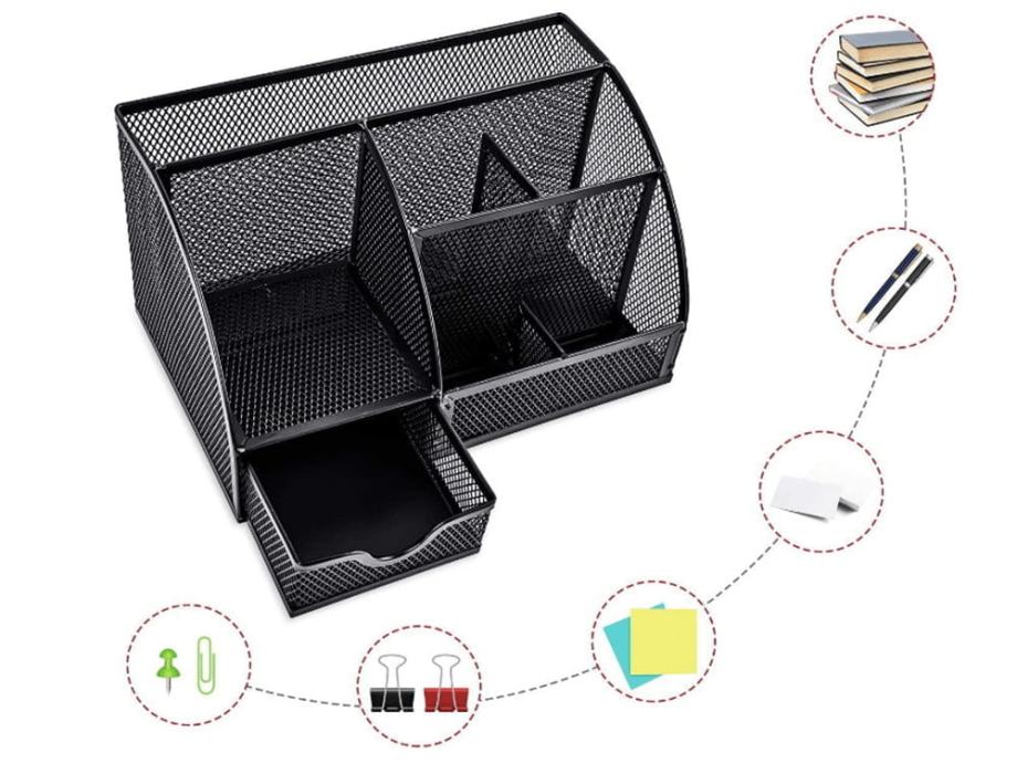 Praktično- organizator stola vrlo je praktičan dodatak koji će biti koristan i kod kuće i na poslu i još mnogo toga. Jednostavno možete staviti potrebne uredske uređaje -Pos, bojice, olovke od filca, gumice, papirnate isječke, ljepila ili škare, kao i pisaće strojeve.