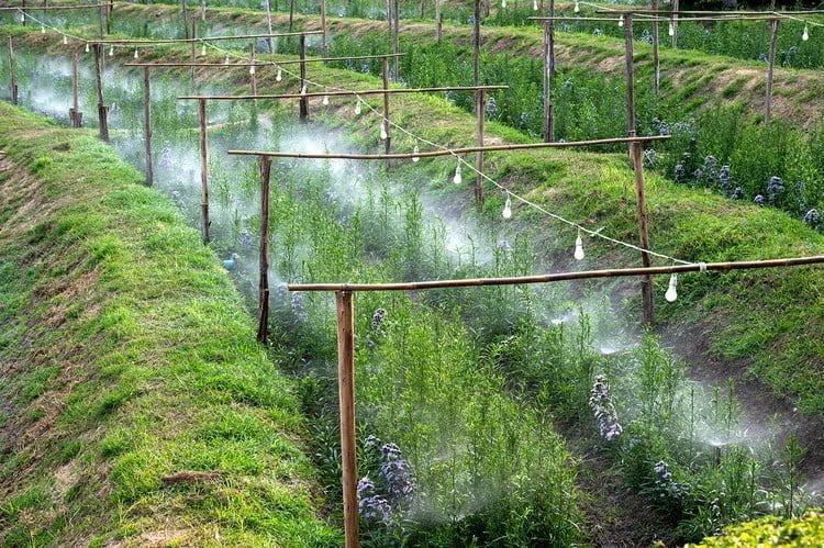 Neposredno hlađenje i zalijevanje- Vodena zavjesa, između ostalog, služi za hlađenje ljeti zahvaljujući finoj magli koju su proizvele sitne mlaznice. Voda isparavanja izvlači toplinu iz okoliša i hladi zrak vrućim danima za najviše 10 ° C. Što je veća temperatura zraka, to je veći učinak hlađenja.