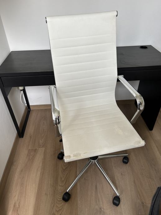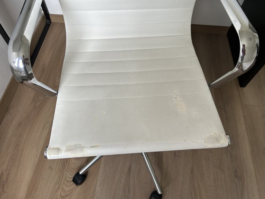 Bijela radna stolica s kožnom presvlakom, koja je ponešto oštećena na sjedištu.