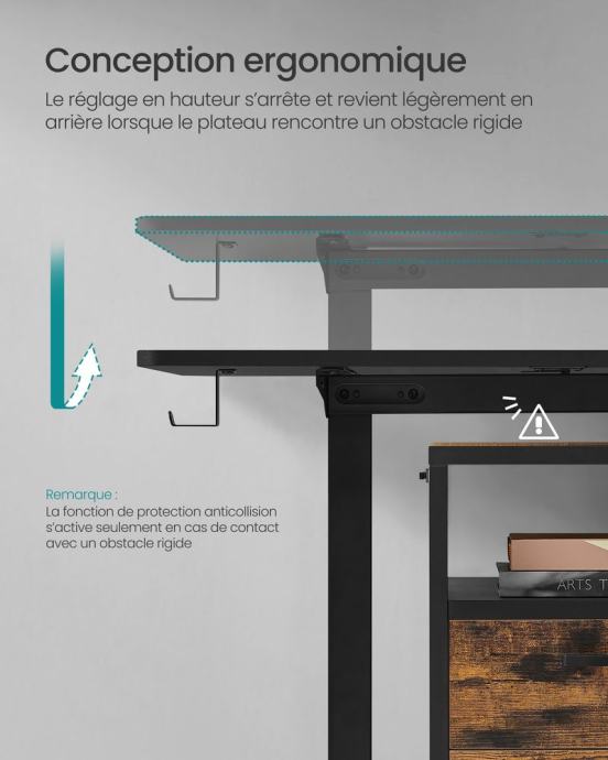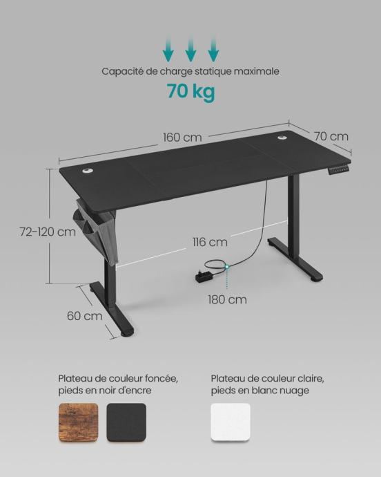Izrađen od čvrstog čeličnog okvira i iverice, stol može izdržati do 70 kg, pružajući vam stabilan i pouzdan radni prostor čak i kada je stol podešen na maksimalnu visinu. Stol se može podesiti između 72 i 120 cm i sprema 4 visine kao brze postavke. Mehanizam za podešavanje visine zaustavlja se i lagano pomiče unatrag kada postoji prepreka i nudi dodatnu sigurnost. Zahvaljujući označenim dijelovima i jasnim uputama, sastavljanje ovog podesivog stola je povjetarac! Manje vremena za postavljanje znači više produktivnog vremena na vašem novom radnom mjestu. Izvrstan motor ovog stojećeg stola osigurava glatko podešavanje visine uz razinu buke manju od 50 dB, čime se osigurava tiho radno okruženje. Oxford platneni organizator za pohranjivanje vaših knjiga i pribora, kuka za vješanje slušalica ili torbi i 2 rupe za držanje kabela - sve to održava vašu ploču stola urednom. Za sve informacije nazovite na broj telefona 092/399-75-19