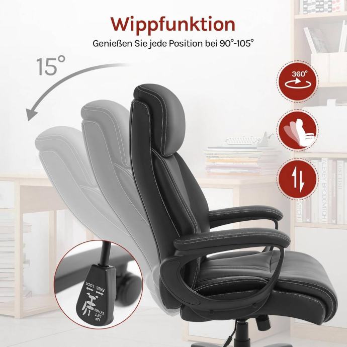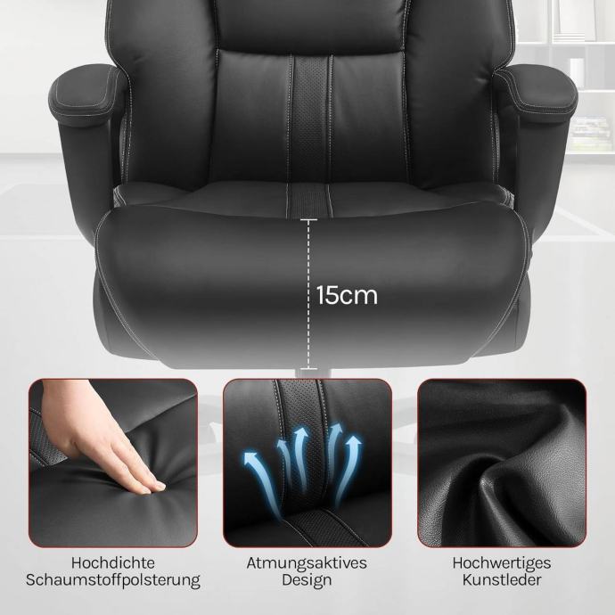 Sjedalo, naslon, nasloni za ruke i naslon za glavu punjeni su visokokvalitetnom pjenom visoke otpornosti, a prošireno i zadebljano sjedalo ravnomjerno raspoređuje pritisak na noge i kukove. Stolica omogućuje nagib naslona do 15° za odmor ili kratki san, dok rotirajuća funkcija i tihi kotačići omogućuju lako kretanje i fleksibilnost u prostoru.