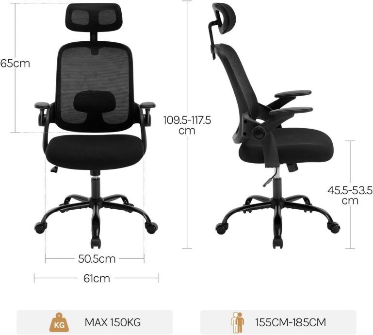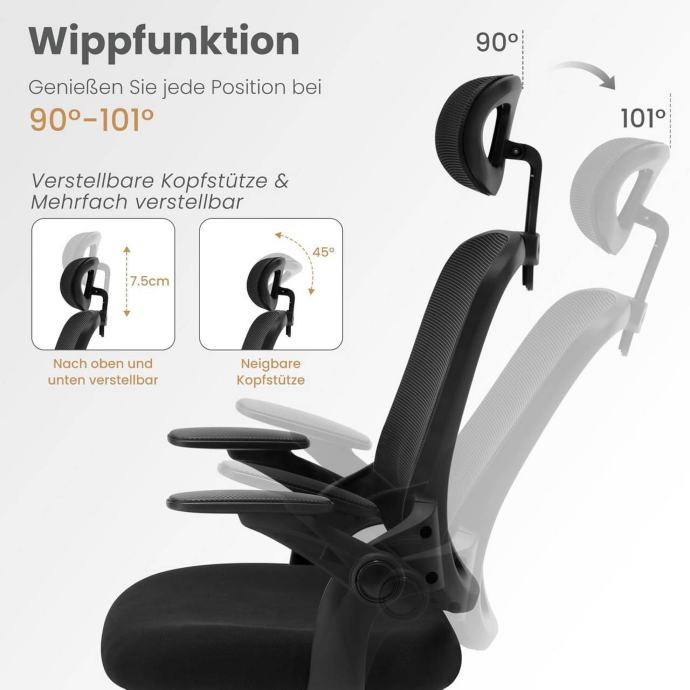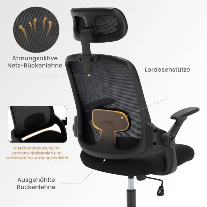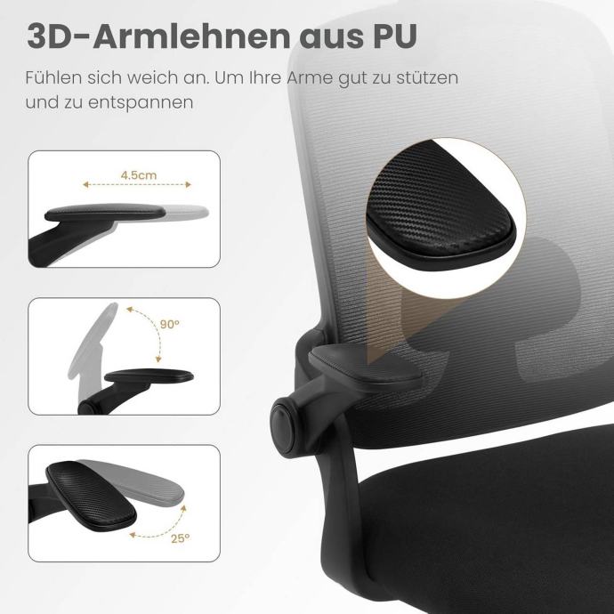 3D nasloni za ruke od PU materijala podesivi su naprijed/natrag (4,5 cm), rotiraju se 25° i mogu se podići do 90° kako biste stolicu mogli jednostavno spremiti ispod stola. Sjedalo je izrađeno od elastične mrežaste tkanine s prozračnim dizajnom i 9 cm pjene visoke gustoće, što osigurava udobnost i hlađenje tijekom dugog sjedenja.