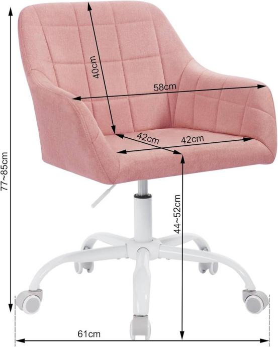 Stolica je visinski podesiva između 44 i 52 cm, a sjedalo i kotačići se okreću 360°, što omogućuje jednostavno pomicanje i rotaciju u svim smjerovima. Čvrsta metalna baza s 5 zvjezdica testirana je prema BIFMA i SGS standardima, nosivost je do 150 kg, a PU kotačići štite pod i omogućuju tihi rad.