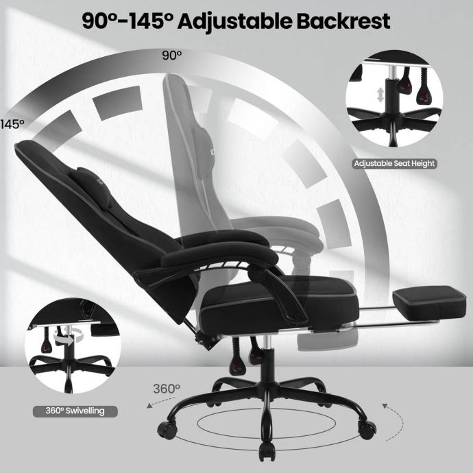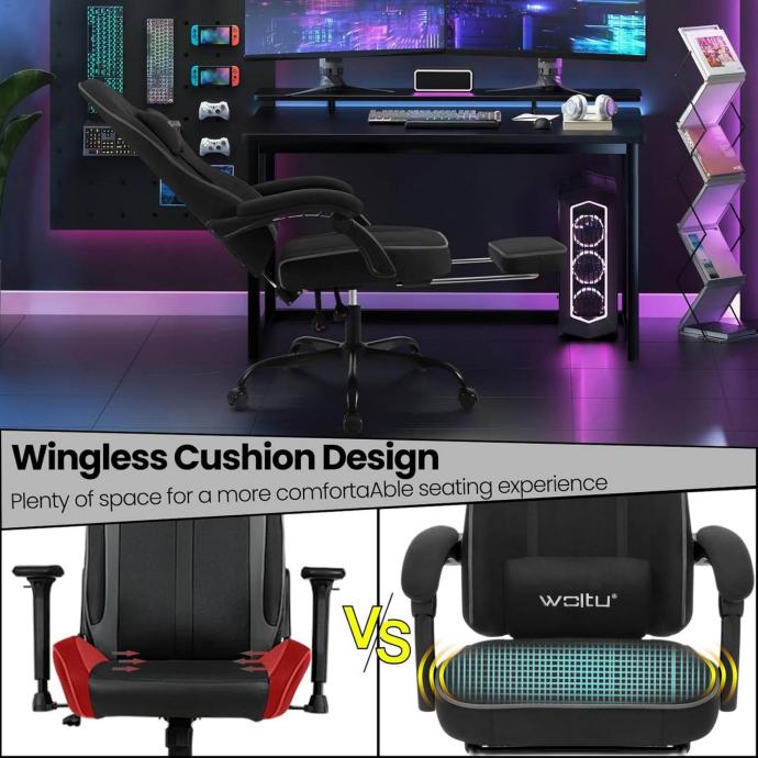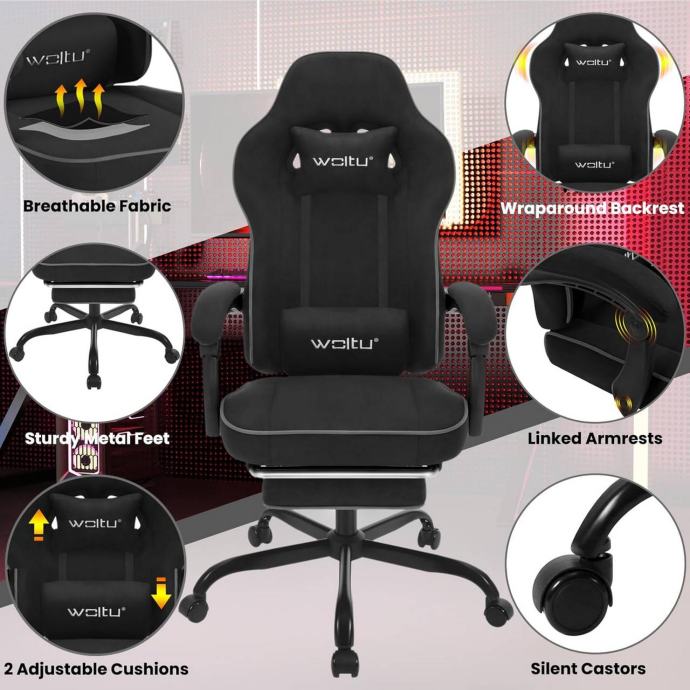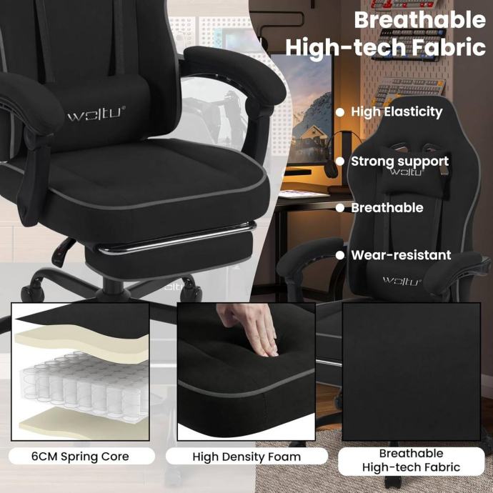 Ergonomski gaming stolac s visokim naslonom, jastukom za glavu i lumbalnim jastukom pruža udobno i prozračno sjedenje zahvaljujući džepastim oprugama, pjeni visoke gustoće i tehničkoj tkanini. Stolac omogućuje dobru cirkulaciju zraka, regulaciju temperature te izvrsnu elastičnost i potporu, sprječavajući nelagodu uzrokovanu toplinom i vlagom, idealno za vruće ljetne dane. Tehnička tkanina je izdržljiva, otporna na vodu i prljavštinu te dugotrajna.