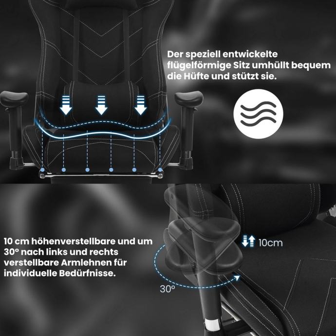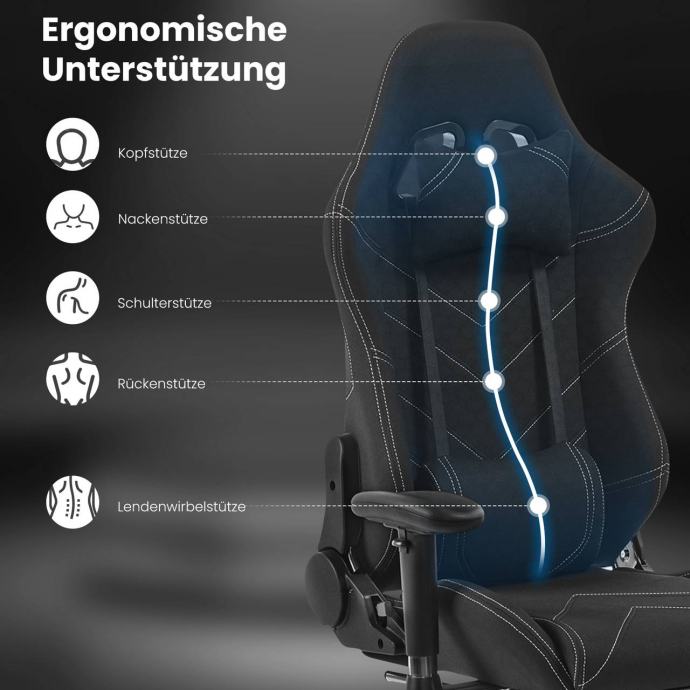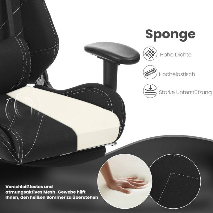 Ova gaming stolica pruža maksimalnu udobnost zahvaljujući naslonu za glavu, lumbalnom jastuku, prozračnom i izdržljivom tkaninskom sjedalu te izvlačivom naslonu za noge, sve tapecirano visokogustoćnom i elastičnom spužvom. Stolica je idealna za dugotrajno sjedenje tijekom gaming sesija ili rada za računalom.