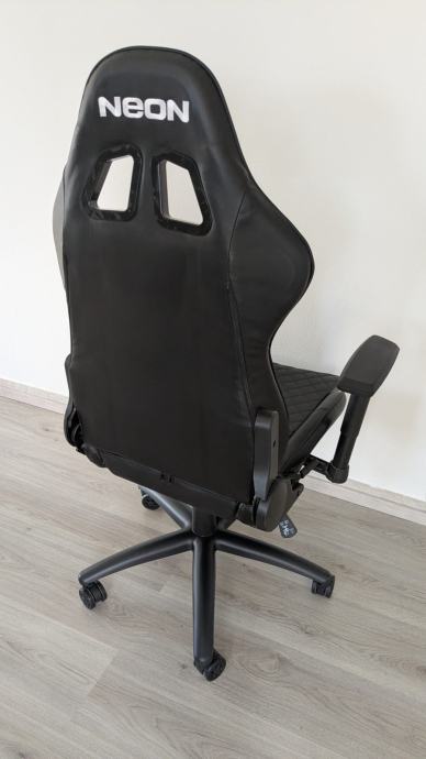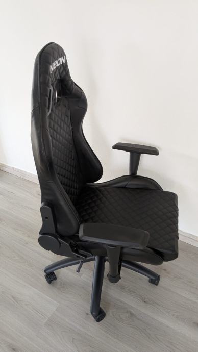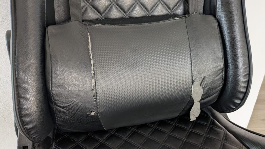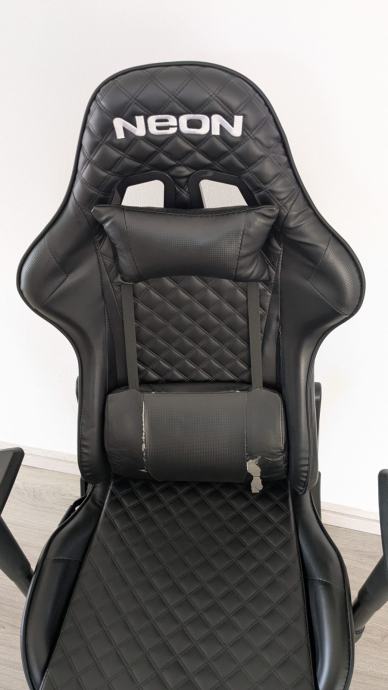 Gaming stolica, sa pomičnim naslonom i podesivim naslonima za ruke te dodatnim jastucima za leđa i vrat. Jastuk za leđa ima površinsko oštećenje od korištenja ali je jastuk čitav i uporabljiv.