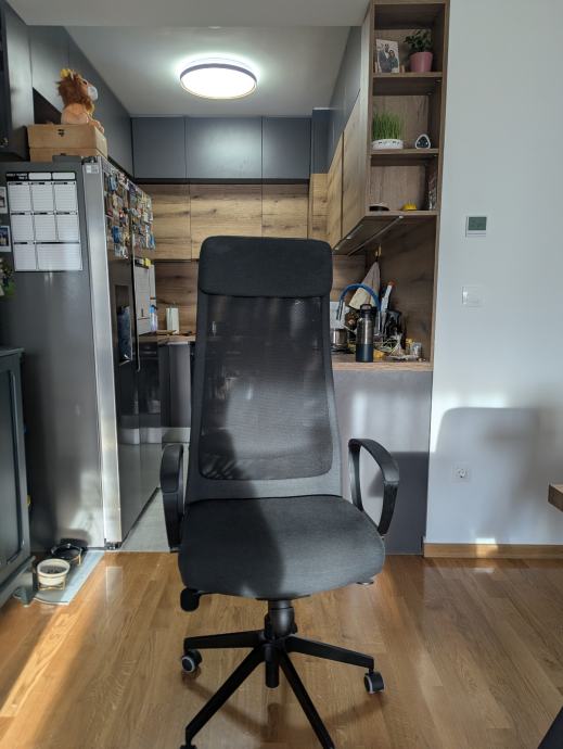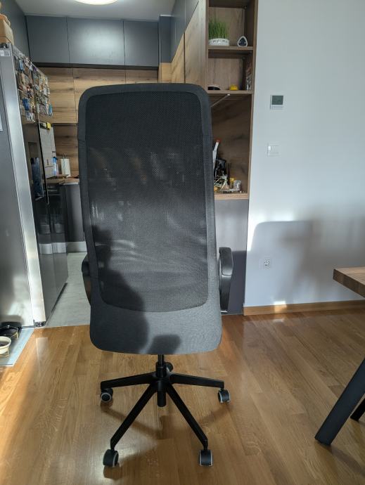 Prodajem rabljenu uredsku stolicu Ikea Markus u tamnosivoj/crnoj boji. Stolica ima visoko naslonjalo od mrežaste tkanine, integrirani naslon za glavu te podloške za ruke. Baza je plastična s kotačićima koji omogućuju lako kretanje po podu. Visina sjedišta je podesiva, a stolica nudi solidnu potporu leđima za dulji rad za stolom.