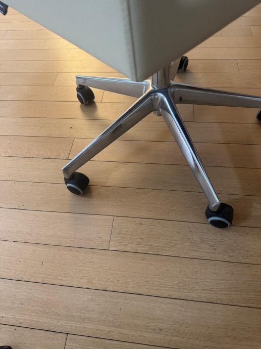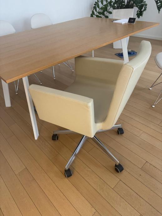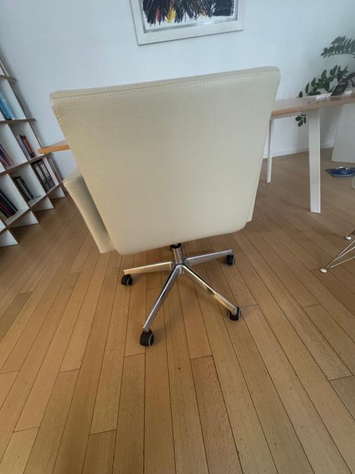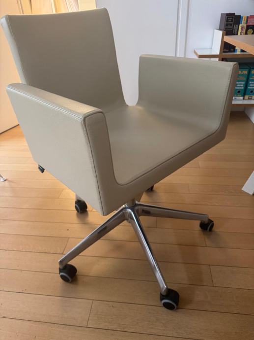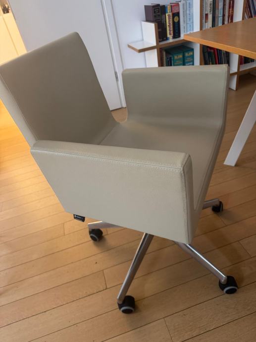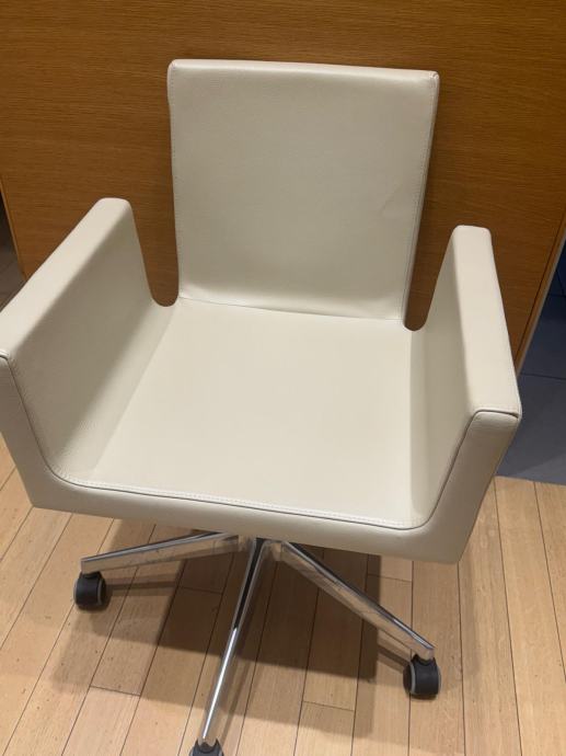 Prodajem četiri malo korištene dizajnerske kožne uredske fotelje u bež boji. Fotelje su od prave kože, neoštečene, udobne, lako se održavaju i imaju kotačiće tako da se lako pomiču.
