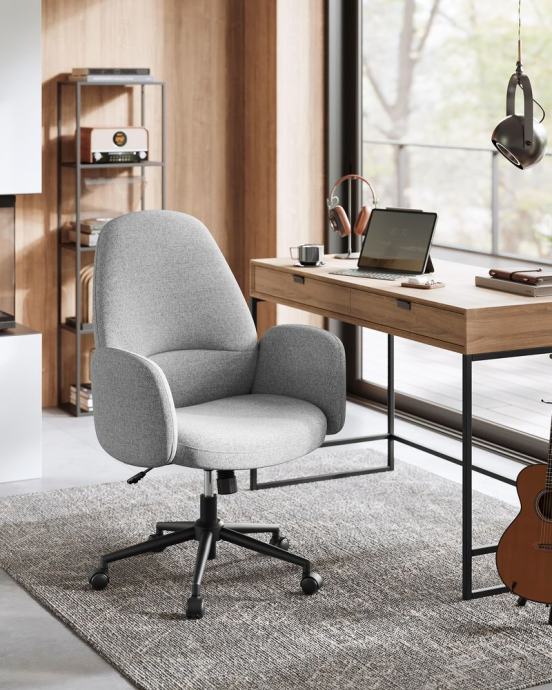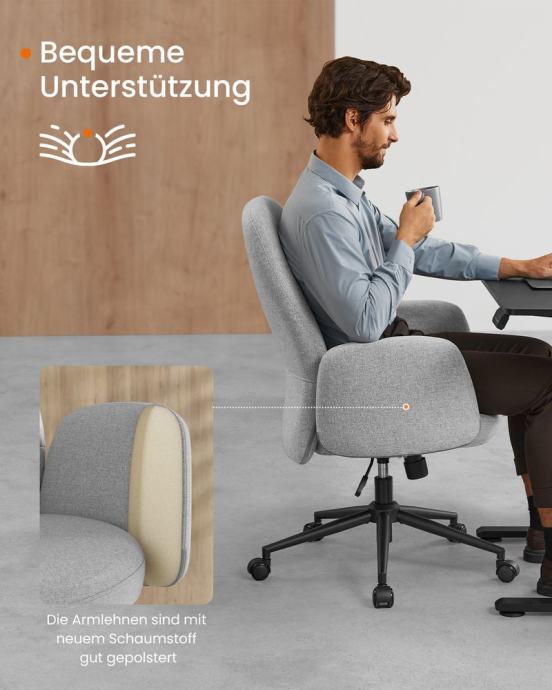 Jedinstvena baza u kombinaciji s modernim dizajnom daje radnoj stolici dašak elegancije, čineći ovu stolicu lakom za integraciju u vašu sobu. Uredska stolica presvučena tkaninom od mješavine pamuka i lana ugodna je za kožu i prozračna, tako da ostajete hladni čak i kada sjedite satima. Stolica s funkcijom ljuljanja od 90-105° podesiva je po visini za 8 cm i osigurava više opuštanja tijela; Tihi PU kotači omogućuju tiho kretanje - korištenje u radnoj ili dnevnoj sobi? Vi odlučujete. Naslon za leđa visok 60 cm savršeno se prilagođava vašem tijelu; Zakrivljeni jastuk debljine 8 cm smanjuje pritisak na bokove. A podstavljeni nasloni za ruke pružaju optimalnu potporu vašim rukama. Osnovna ploča debljine 2,5 mm nudi visoku stabilnost. Baza je prošla ispitivanje statičkim tlakom s opterećenjem od 1.136 kg. Za sve informacije nazovite na broj telefona 092/399-75-19