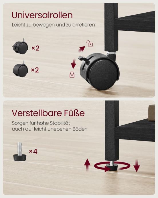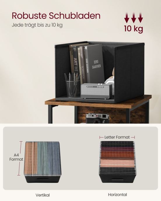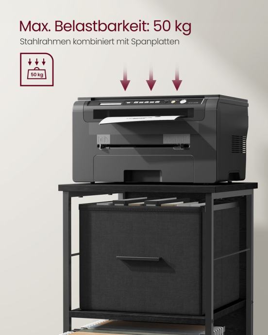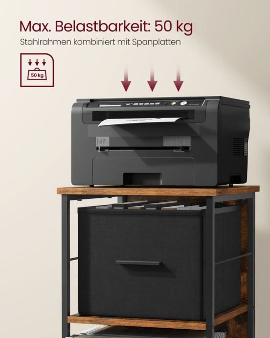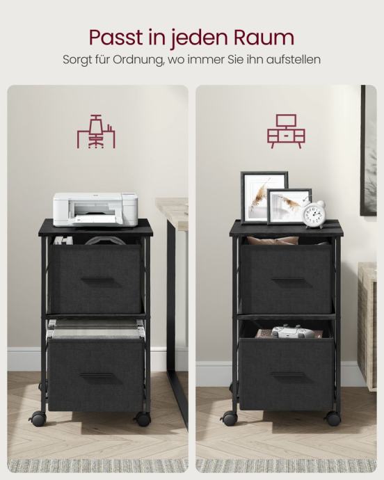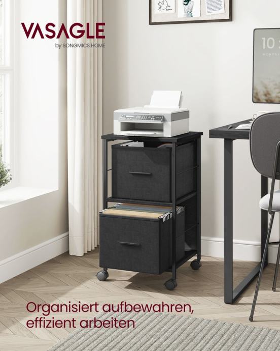 2 ladice od tkanine primaju dokumente formata A4 i letter, dok otvor iznad njih omogućuje brz pristup označenim mapama. Optimizirajte svoj prostor i učinkovitost s ovim uredskim ormarićem. Izrađena od čvrstog čeličnog okvira i iverala, kockasta polica pratit će vas dugi niz godina. Uz nosivost do 50 kg, vaš je uredski materijal uvijek siguran i zaštićen. Uz jasne upute, okvir se može sastaviti u tren oka. Zatim umetnite ladice za tkanine i gotovi ste! Ali to nije sve, jer ladice možete slobodno postaviti gdje god želite! Koristite ovaj komad namještaja kao stalak za pisač u svom kućnom uredu ili kao elegantnu policu za umjetnički pribor ili šablone za rukotvorine. Ovaj ormarić zadovoljava širok raspon potreba za pohranom. S četiri kotačića rotirajuća za 360°, od kojih 2 imaju kočnice, možete bez napora premjestiti ormarić za dokumente i zaključati ga po želji. Podesive noge nude visoku stabilnost čak i na blago neravnom terenu. Za sve informacije nazovite na broj telefona 092/399-75-19