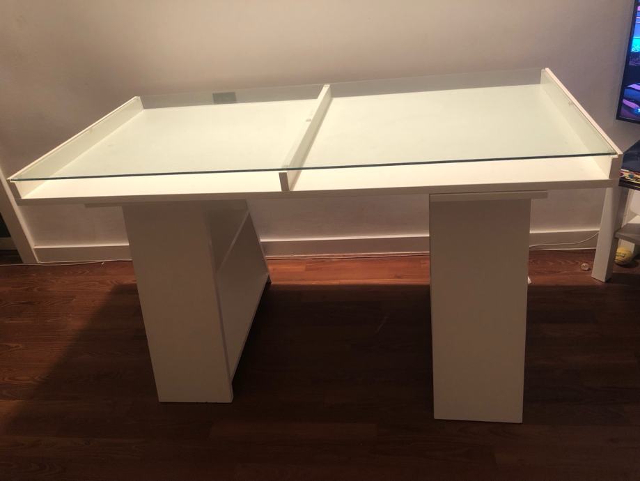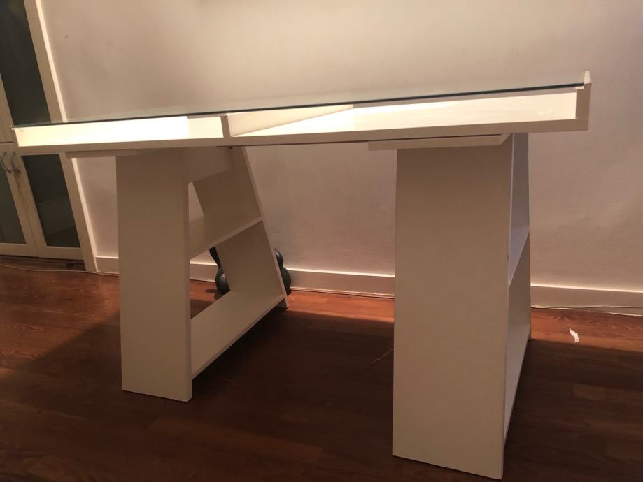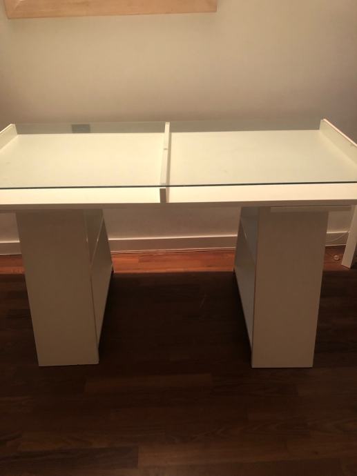 Lijepi Ikea pisaći stol.Gornji dio debelo staklo,ispod praktični pretinci za papire i sl.Noge pomične lijevo/desno po širini stolice svaka sa 2 police.