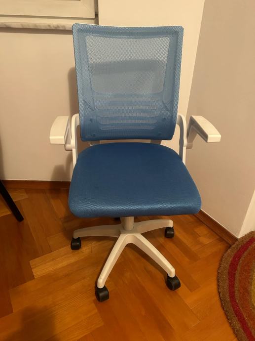 Prodaje se plavo-bijela udobna stolica s kotačićima zbog izlaska iz ureda.