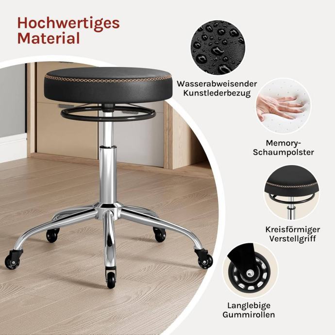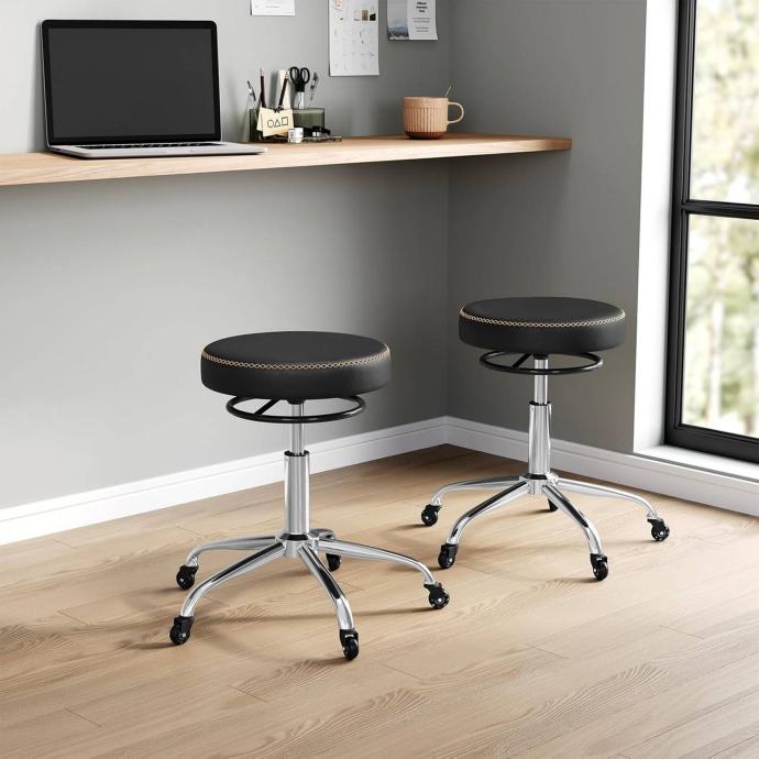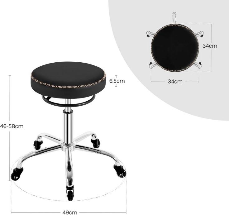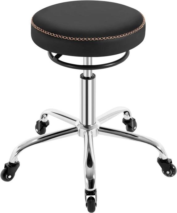 Ova visoko-podesiva stolica s kotačićima pruža udobnost i praktičnost zahvaljujući sjedalu tapeciranom sintetičkom kožom i punjenjem od pjene visoke gustoće koja se prilagođava obliku tijela. Stolica je otporna na ogrebotine, abraziju i vodu, te je jednostavna za čišćenje.