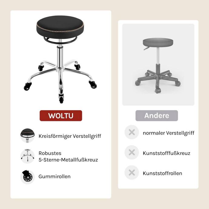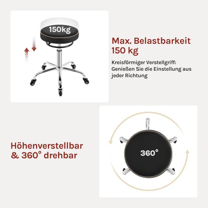 Ergonomski dizajn omogućuje podešavanje visine sjedala od 46 do 58 cm pomoću prstena ispod sjedala, što je idealno za korisnike različitih visina i stolove različitih visina. Sjedalo se okreće 360° i opremljeno je univerzalnim kotačićima koji omogućuju lako i fleksibilno kretanje.