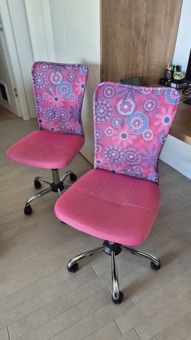Poklanjam dvije dječje stolice ružičaste boje s uzorkom na naslonu. Stolice imaju kotačiće i metalnu bazu, što omogućuje lako premještanje.