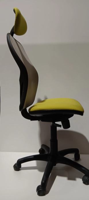 Kotaci; peterokraka baza; mogucnost regulacije visine i sinkronizirano podesavanje nagiba sjedala i naslona koji se moze prilagodjavati nagibu tijela ili pricvrstiti u zeljenom polozaju; podesivi lumbalni podupirac; odmoriste za glavu; naslin za ledja mreza sive boje; sjedalo PU pjena, presvuceno dekorativnom tkaninom zelene boje. Izlozbeni primjerak.