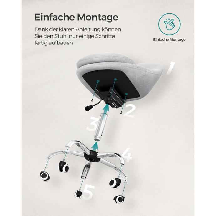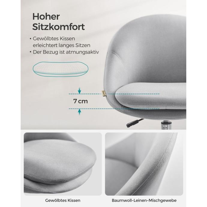 Uz šik izgled i jednostavne geometrijske linije, ova okretna stolica će vašoj sobi dodati jedinstveni šarm. Možete ga koristiti za rad, učenje ili nanošenje šminke. Dvostruki dobro podstavljeni jastuk (gornji dio debljine 7 cm), zakrivljeno, veliko sjedalo ublažava pritisak na bokove; navlaka od Sherpa tkanine je prozračna. Sve nudi visoku razinu udobnosti sjedenja. Ova kompaktna radna stolica koja se okreće za 360° (60 x 60 cm) može se podesiti po visini za 10 cm i nema naslone za ruke. Kada nije u upotrebi, stolicu možete gurnuti ispod stola kako biste uštedjeli prostor. Vijcima pričvrstite osnovnu ploču na dno sjedala, postavite plinske boce i kotače - računalna stolica se sastavlja u samo nekoliko koraka. Za sve informacije nazovite na broj telefona 092/399-75-19