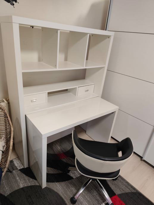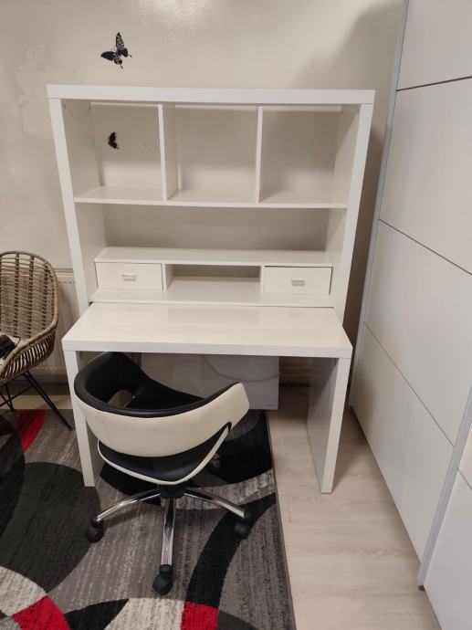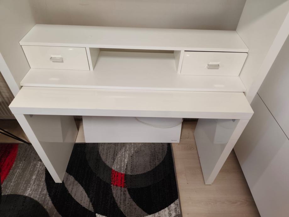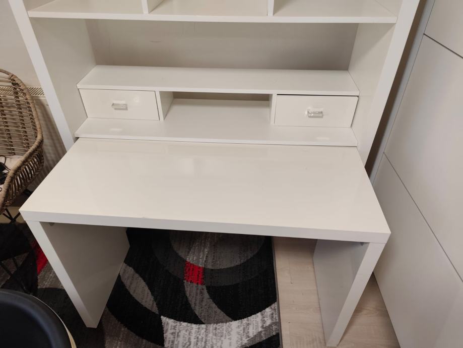 Prodajem radni stol,bijeli,visoki sjaj,sastoji se od dva djela,stol se po potrebi izvuče ili uvuce unutra,dimenzija visina 157 cm,sirina 117 cm,dubina 48 cm uvucen.