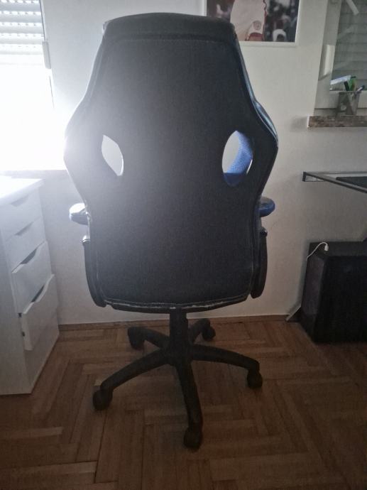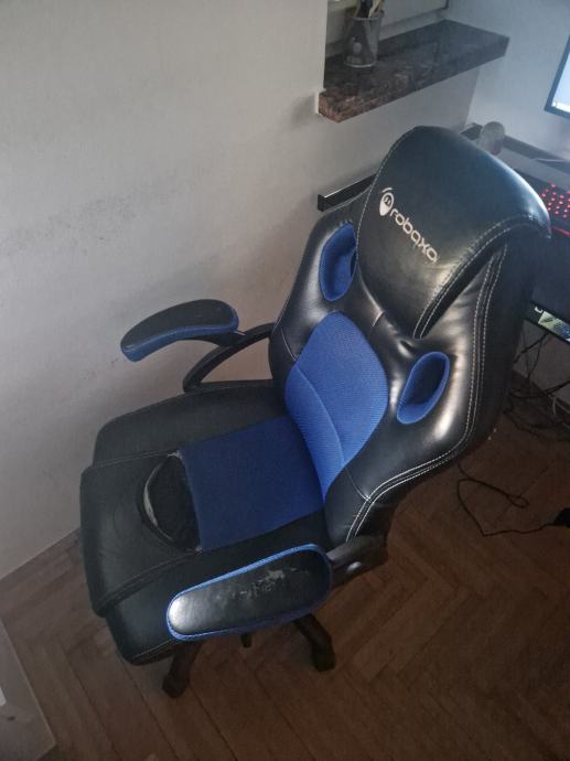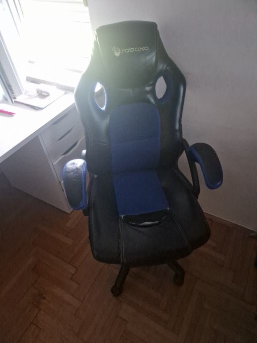 Robaxo gaming stolica korištena uz minimalna oštećenja. Mogućnost 360 okretaja podizanja i spuštanja stolice te pomicanja s kotačićima.