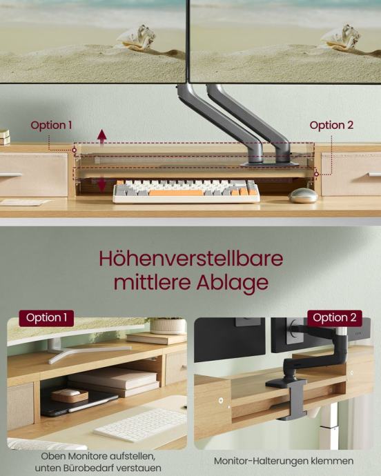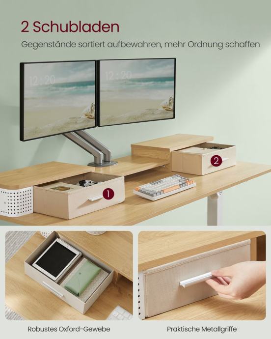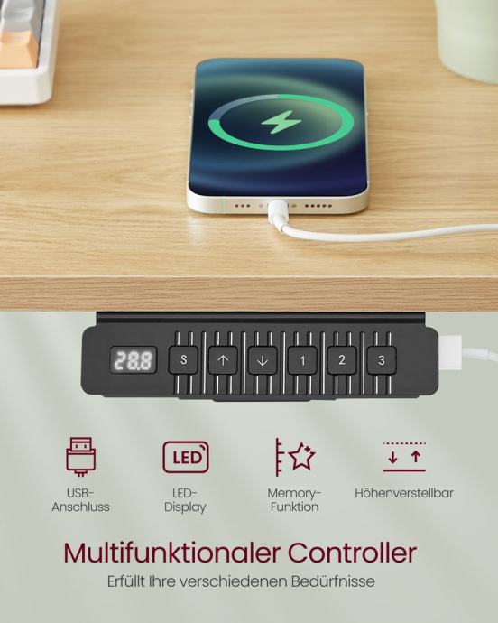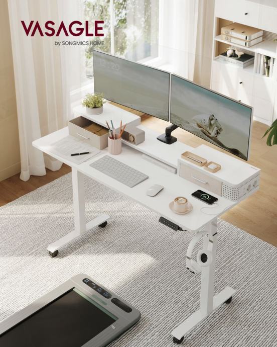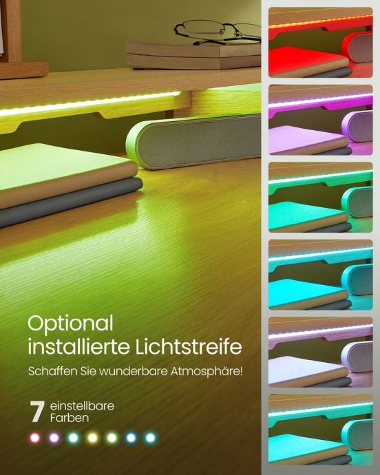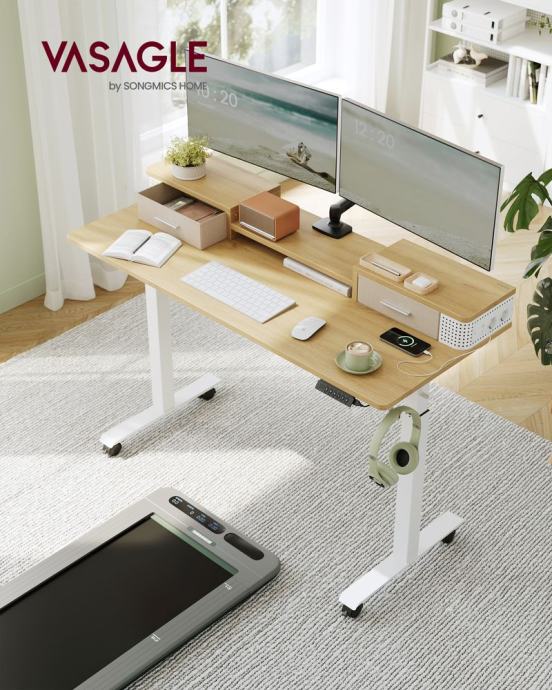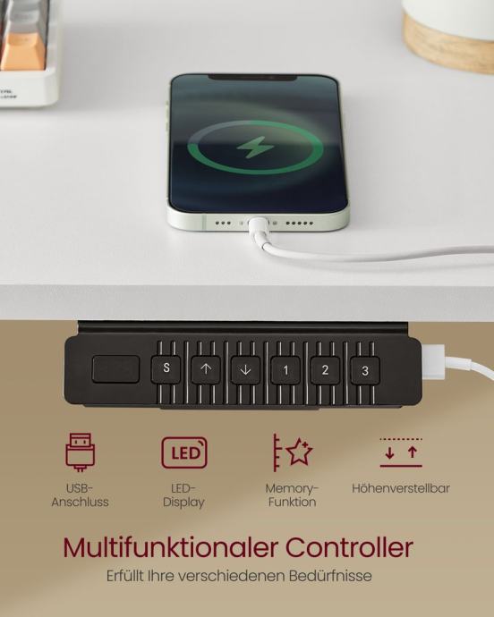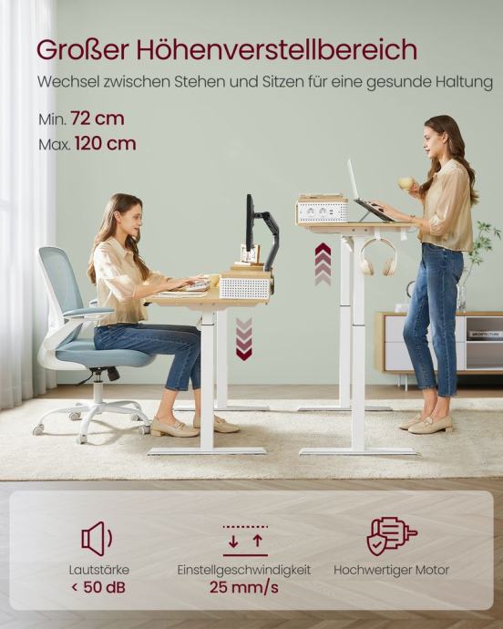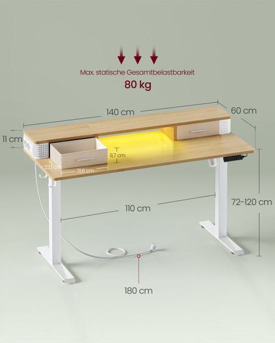 Ovaj stol ima kontinuirano podešavanje visine između 72 i 120 cm. Sjedeći ili stojeći? Pronađite idealno držanje; Osim toga, ukupno 3 visine mogu se spremiti kao brze postavke. Osigurava glatko podešavanje i nisku razinu buke (< 50 dB); mehanizam za podešavanje visine zaustavlja se i lagano pomiče unatrag kada naiđe na prepreku kako bi zaštitio stol od oštećenja. Dvostruka potporna šipka daje ovoj ploči stola visoku stabilnost – nema više njihanja. Zahvaljujući čeličnom okviru, ovaj stol podesiv po visini može izdržati do 80 kg. Srednja polica postolja za monitor je podesiva po visini; s obje strane nalaze se 2 ladice za sitnice; Perforirane ploče za skrivanje kabela i 2 AC utičnice i 2 USB priključka za punjenje. Bočna kuka može se koristiti za vješanje slušalica radi lakšeg pristupa; uključena podesiva LED rasvjeta osvjetljava vaš radni prostor i istovremeno poboljšava atmosferu. Zahvaljujući označenim dijelovima i lako razumljivim uputama, možete brzo sastaviti stol podesiv po visini. Ovako možete u trenu pronaći fleksibilan stil rada! Za sve informacije nazovite na broj telefona 092/399-75-19