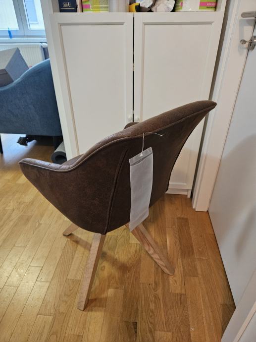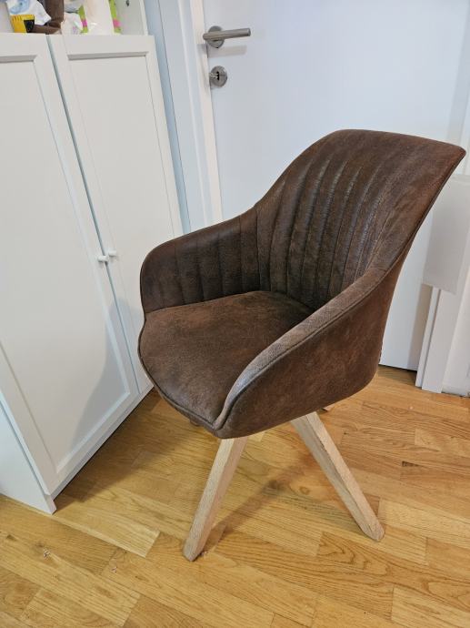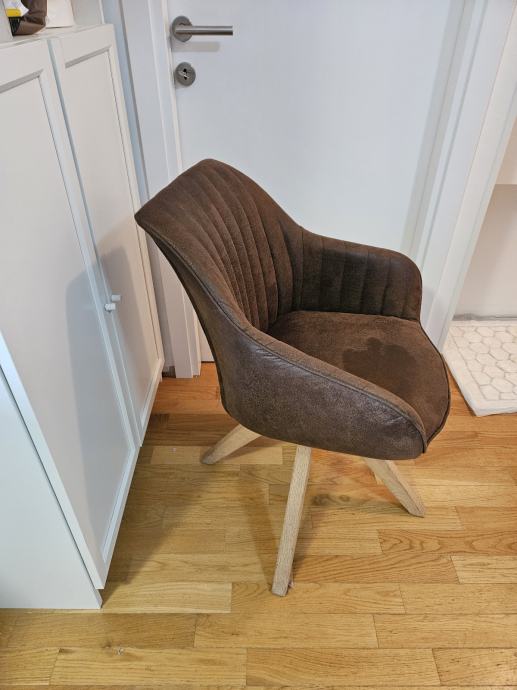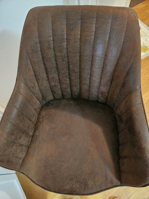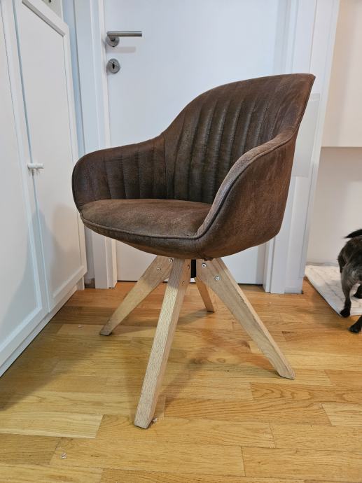 Prodajem novu stolicu smeđe boje s presvlakom od eko kože teksturiranog izgleda. Sjedište i naslon oblikovani su s karakterističnim vertikalnim šavovima koji daju stolici elegantan izgled. Nasloni za ruke su integralni dio konstrukcije i pružaju udoban oslonac. Noge su izrađene od drva svjetle boje, što doprinosi modernom i toplijem dojmu. Vrti se oko svoje osi