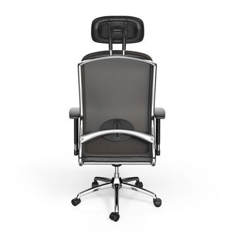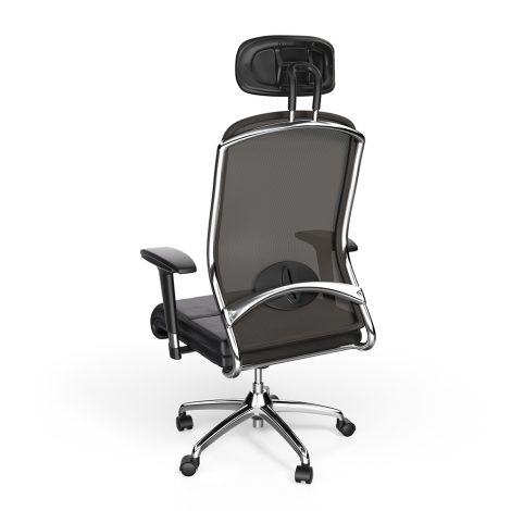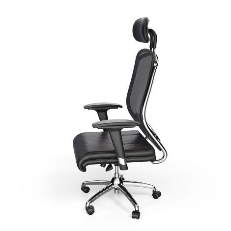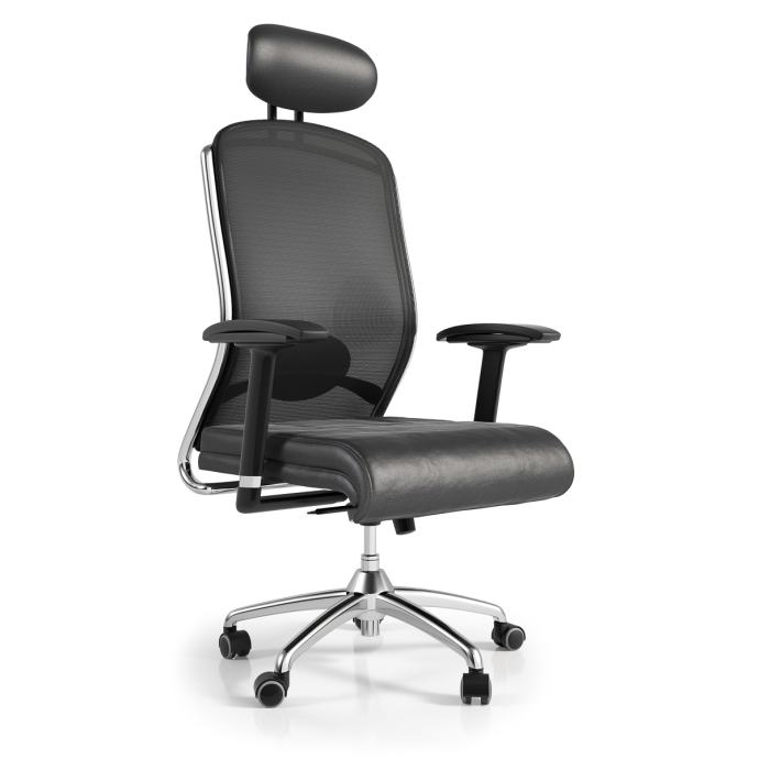 Uredska fotelja modernog dizajna s tapeciranim sjedalom u crnoj eko koži ili tkanini te naslonom u crnoj mreži. Moguć odabir sjedala u tkanini, u ponuđenim bojama tkanina King Flex i Fenice. Rukonasloni su podesivi po visini. Peterokraka baza kromirana s kotačima za tvrde podove. Naslon za glavu moguće je podešavati.