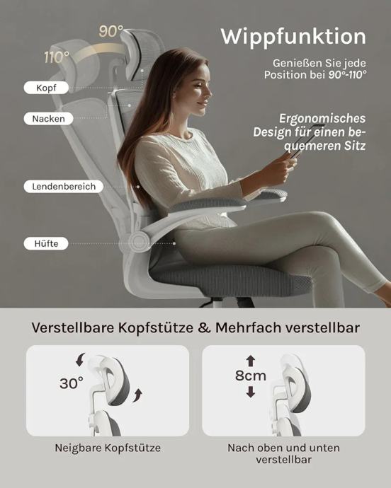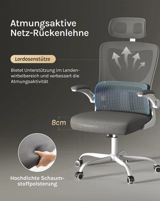 Ergonomska uredska stolica, Radna stolica s funkcijom ljuljanja, Podesivi naslon za glavu, Reverzibilni nasloni za ruke, Radna stolica s lumbalnom potporom za ured, Uredske stolice 150 kg, Siva