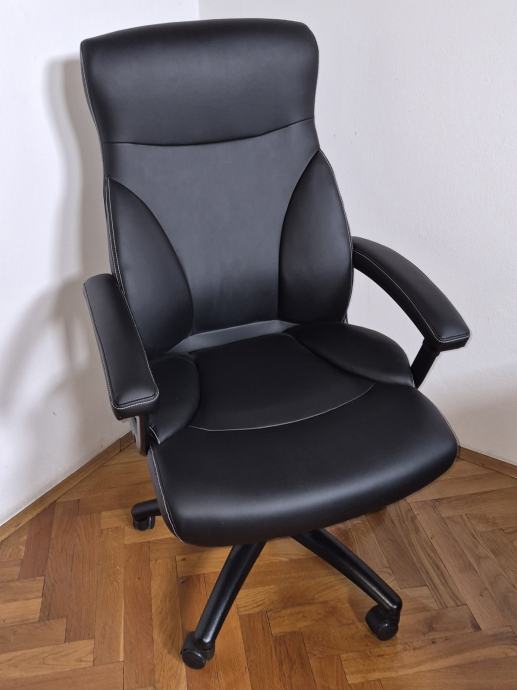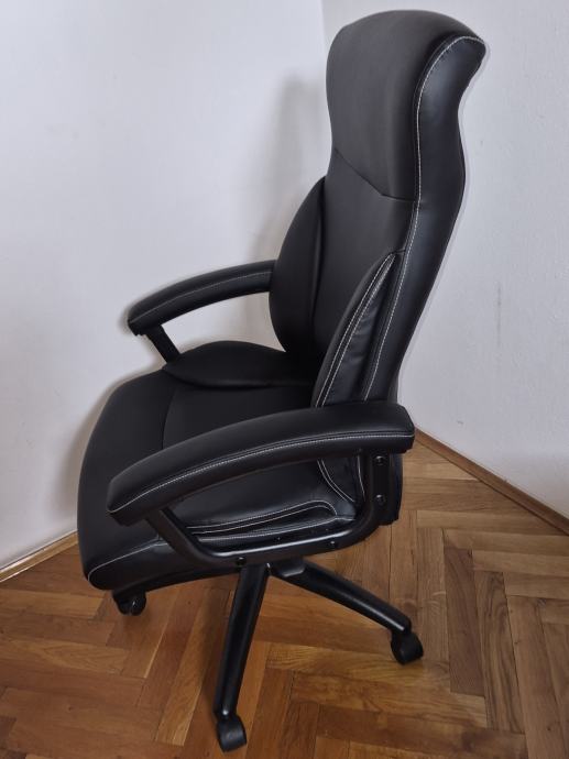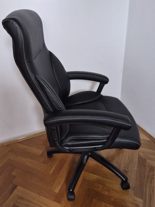 Prodajem kvalitetnu uredsku fotelju u besprijekornom stanju. Fotelja je izuzetno udobna, s visokim naslonom koji dobro podupire leđa i vrat. Debelo tapecirana sjedalica i naslon, presvučeno umjetnom kožom s vidljivim bijelim šavovima.
