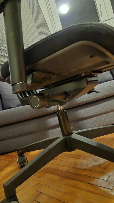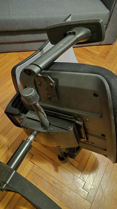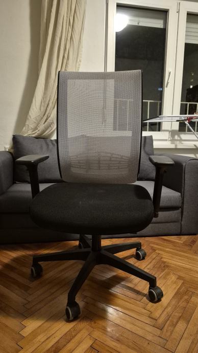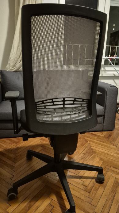 Prodajem uredsku stolicu crne boje s mrežastim naslonom za leđa. Stolica ima podesive naslone za ruke, kotačiće za lako kretanje po podu te mehanizam za podešavanje visine sjedala i nagiba. Baza je petokraka, također u crnoj boji. Sjedalo je presvučeno tamnom tkaninom. Stolica vrlo kratko korištena.
