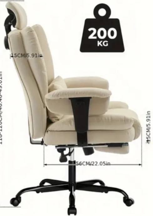 Široko sjedalo (oko 58 cm) i naslon (oko 53 cm) prikladni i za krupnije osobe. Nosivost do 200 kg, čvrsta metalna baza s kotačićima za lako kretanje. Podesiva visina sjedala (otprilike 66–74 cm) pomoću plinskog podizača. Debelo podstavljen naslon i sjedalo, dodatni jastuk za lumbalni dio leđa. Podesiv ili nagibni mehanizam naslona za veći komfor tijekom dužeg sjedenja. Ima naslon za noge koje se izvlači.