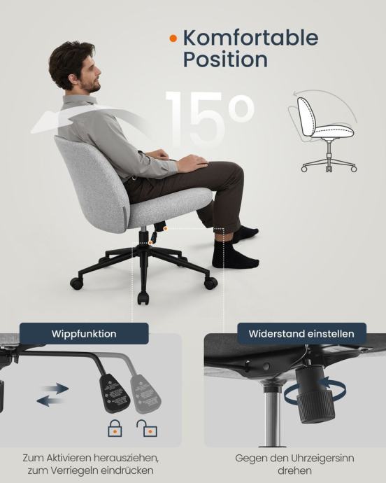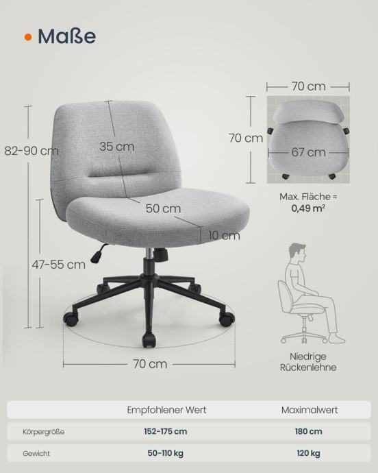 Jedinstvena križna baza u kombinaciji s modernim dizajnom daje stolici dašak elegancije, što je čini lakom za integraciju u vašu sobu. Uredska stolica presvučena mješavinom pamuka i lana ugodna je za kožu i prozračna, tako da ostajete hladni čak i kada sjedite satima. Funkcija ljuljanja od 90-105° idealna je za opuštanje. Sjedalo se može podesiti po visini za 8 cm kako biste mogli zauzeti najudobniji mogući položaj sjedenja i položaj nogu. Sa sjedalom širine 67 cm i naslonom visokim 35 cm, siva okretna stolica osigurava visoku udobnost. A s pjenastim punjenjem, jastuk debljine 10 cm nudi meku potporu. Mehanička podnožna ploča debljine 2,5 mm nudi visoku stabilnost. Križna baza promjera 72 cm prošla je ispitivanje statičkog tlaka s opterećenjem od 1136 kg. Plinska boca je testirana od strane SGS-a za maksimalnu sigurnost. Za sve informacije nazovite na broj telefona 092/399-75-19
