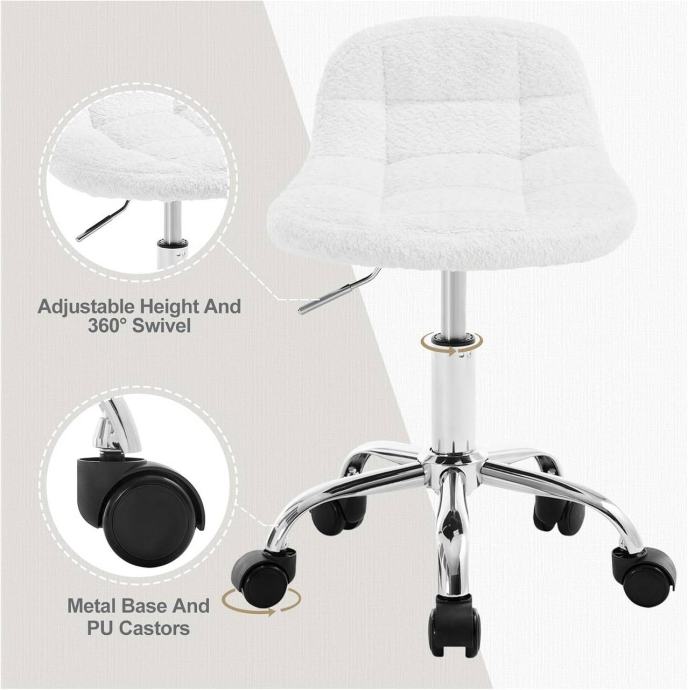 360° rotirajuće sjedalo i kotačići olakšavaju kretanje i rotaciju po uredu, sobi ili studiju, dok čvrsta kromirana metalna baza jamči stabilnost i sigurnost. Stolac može podnijeti do 120 kg, a PU kotačići štite pod i omogućuju tihi rad.