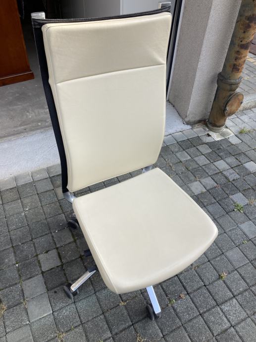 Prodajem uredsku stolicu. Stolica je od kože, boje bijele kave i ima nekoliko položaja, a ima i kotače.
