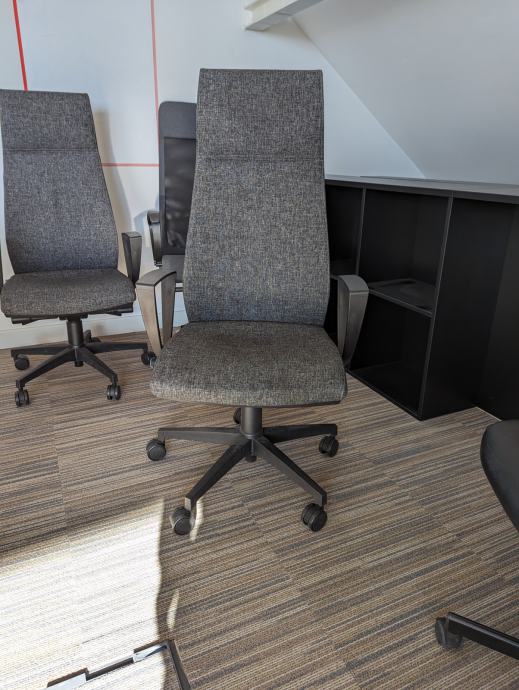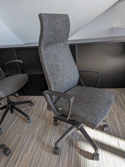 Ergonomska uredska stolica modernog dizajna s visokim naslonom i integriranim naslonom za glavu. Sjedalo i naslon tapecirani. Postojeća spužva sjedala s dodatnim slojem memorijske pjene od 1cm debljine. Poleđina naslona u crnom polipropilenu.