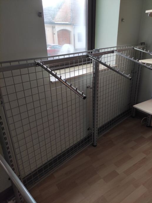 Dimenzije: dužina 2m, visina 1.20, dodatna zidna montaža (regulacija) do 10cm. 4 kose kromirane poluge za vješanje (svaka sa po 9 kukica) Stalaža se može demontirati i ponovno sklopiti.