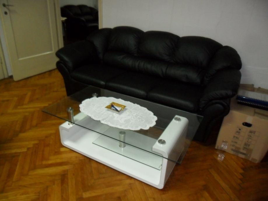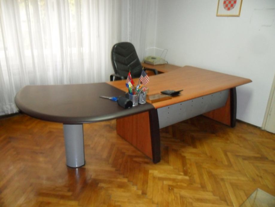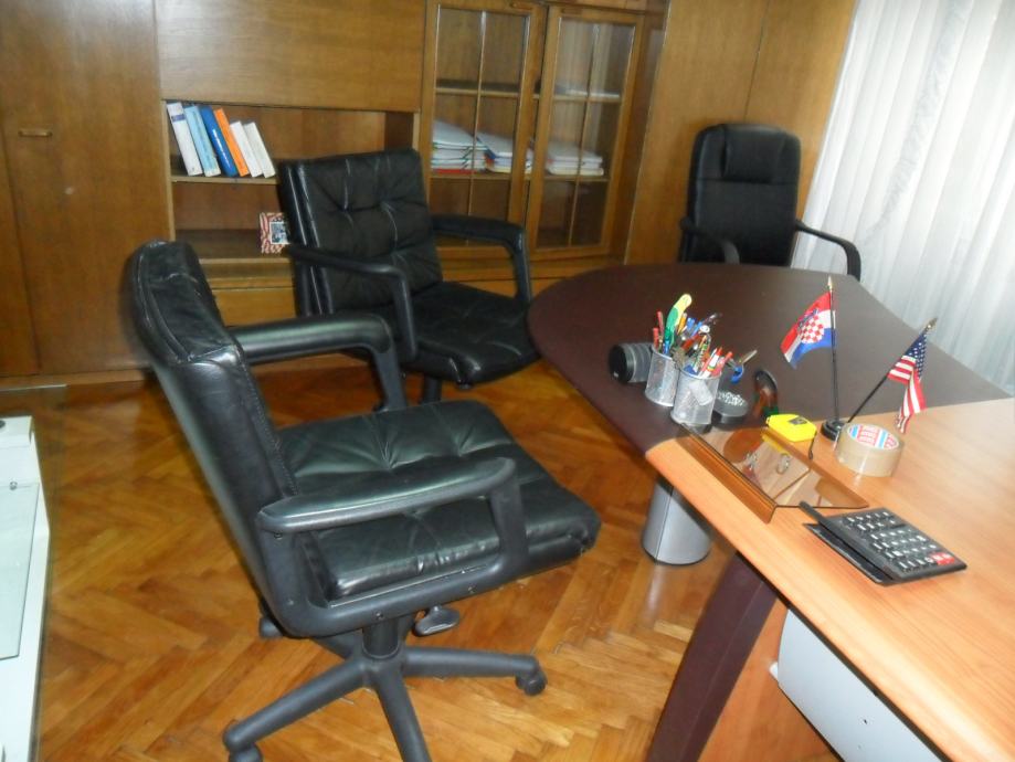 Prodajem noviji namještaj iz odvjetničkog ureda u Zagrebu za dvije prostorije (veliki radni stol 180x97-120 cm ,dodatak polukružni cca 100cm, pomoćni stolić 120x60, ladičar 58x42, povezivo u komplet, te dva stolića -bijeli visoki sjaj sa staklom 120x65x40 cm i željezni sa staklom 90x55x45 cm, 1 visoka kožna fotelja, dvije niže kožne fotelje, dvije niske fotelje, kožni trosjed 200x 90x80, kožni dvosjed 145x90x80,