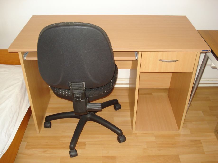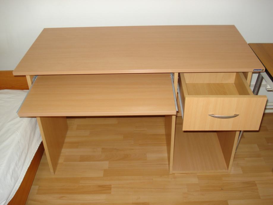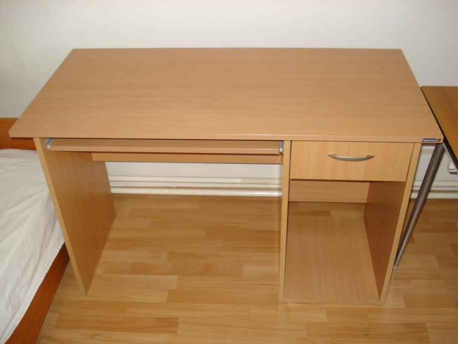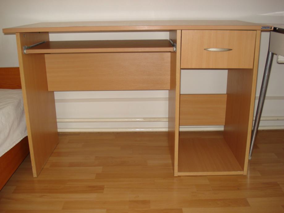 Ima jednu ladicu, policu za tastaturu ili slično, koja se izvlači i uvlači, te odjeljak za kompjuter ili slično.