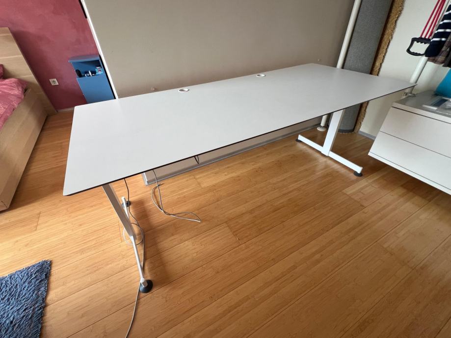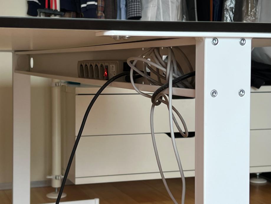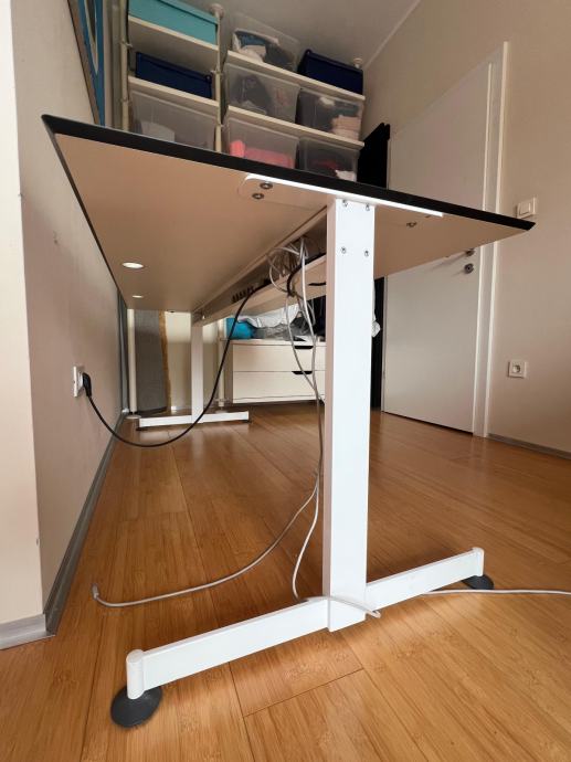Stol s metalnom T potkonstrukcijom, radna ploča kompakt bijela s crnom jezgrom 13mm, ispod ploče ugrađena polica za odlaganje kablova.