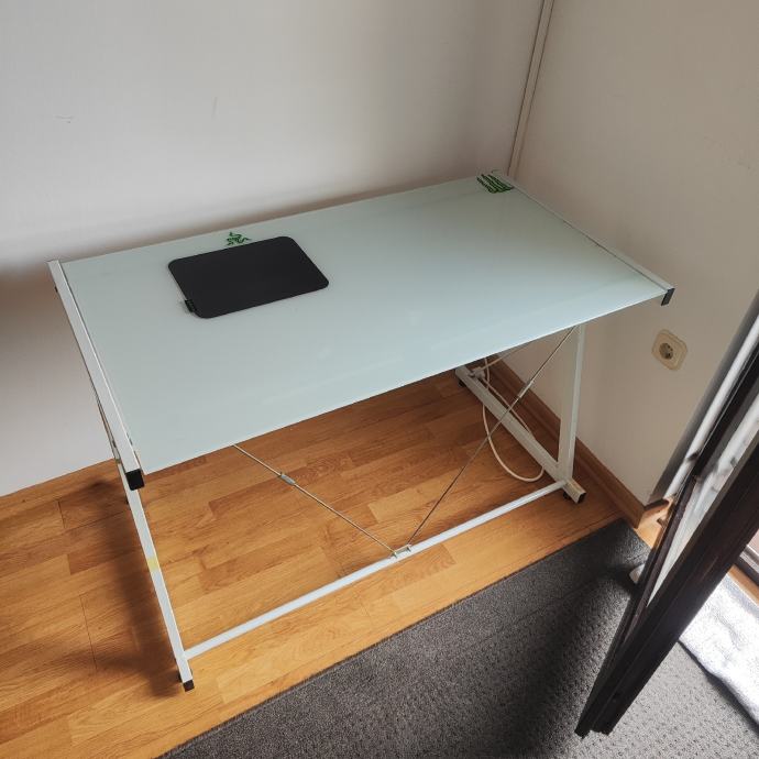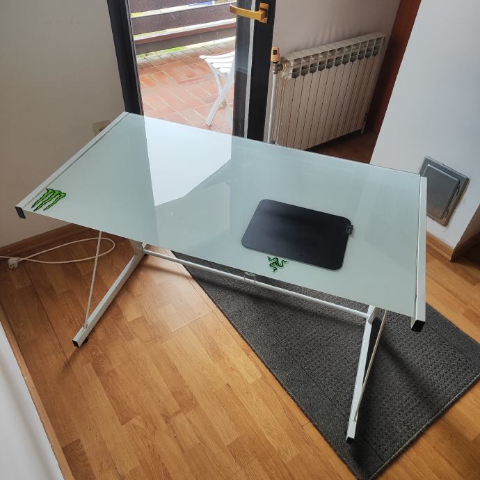 Stakleni bijeli stol za gaming mali vidljivi detalji koristenja ali se ne skuzi...