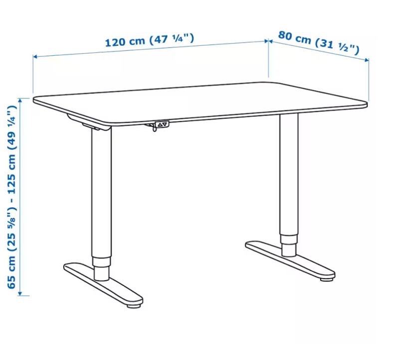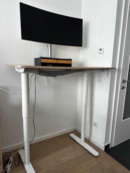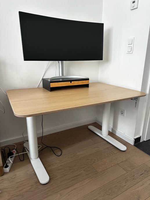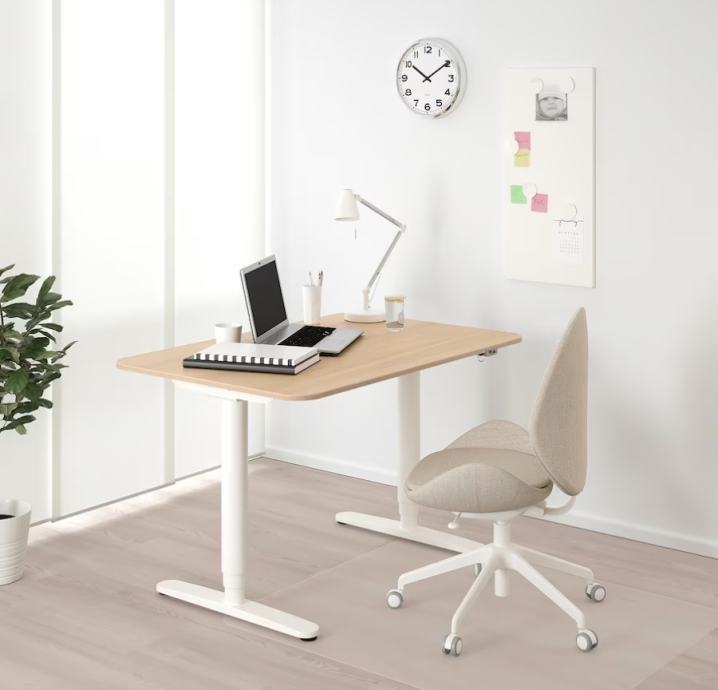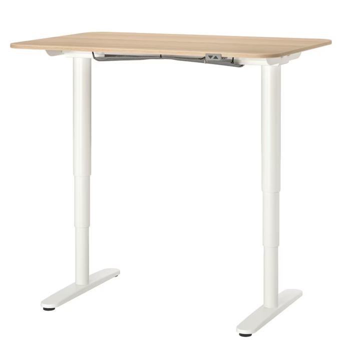 BEKANT Radni stol za sjedenje/stajanje, bijelo bajcani hrastov furnir/bijela, 120x80 cm, visina od 65cm to 125cm.