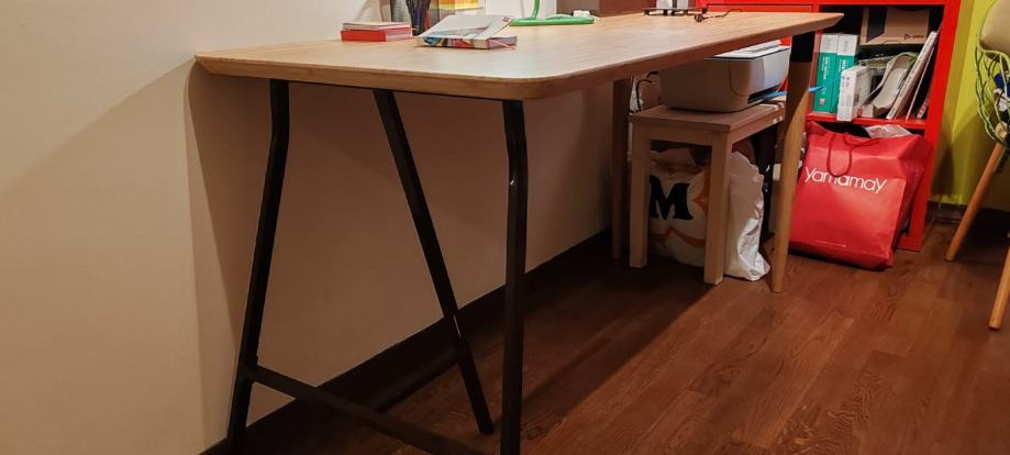 Prodajem odlično očuvani radni stol HILVER koji s jedne strane stoji na postolju LERBERG, a s druge strane su HILVER noge. Postolje je incijalno bilo bijelo, ali je prefarbano u smeđe. Ploča stola, HILVER, više nije u ponudi pod tim imenom - najsličnija ploča danas je ANFALLARE.