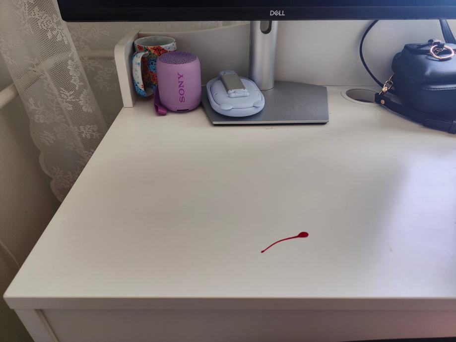 Na stolu jedini trag koristenja je vidljiv na slici gdje se prolio crveni lak zbog cega je dodatno snizena cijena.
