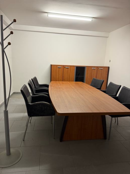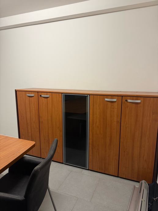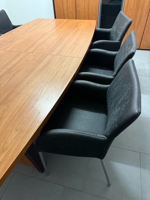 Prodajem komplet uredskog namještaja koji uključuje konferencijski stol, 6 stolica i ormar. Stol je pravokutnog oblika s blagim zaobljenjima, izrađen u tonu trešnje s tamnom bazom. Stolice su tapecirane u crnoj boji s metalnim nogicama, elegantnog i praktičnog dizajna. Ormar je većih dimenzija, u istom tonu trešnje kao i stol, s više vrata od kojih je jedno stakleno u crnoj boji. Sav namještaj je međusobno usklađen i čini zaokruženu cjelinu pogodnu za opremanje konferencijske sobe ili većeg ureda.