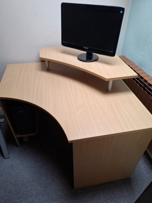Prodaje se kutni radni stol u odličnom stanju sa policom za računalo i povišenjem za monitor. Dimenzije 110 x 110cm Visina radne površine 75cm, Visina do police nosača monitora 90CM