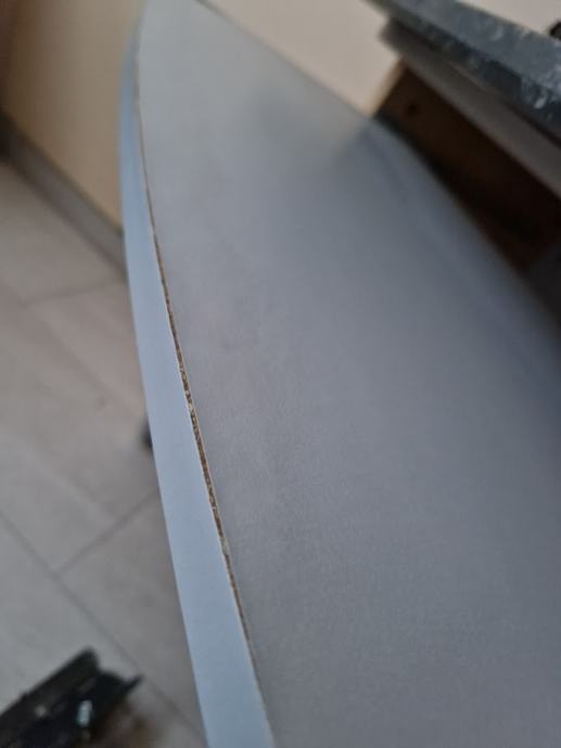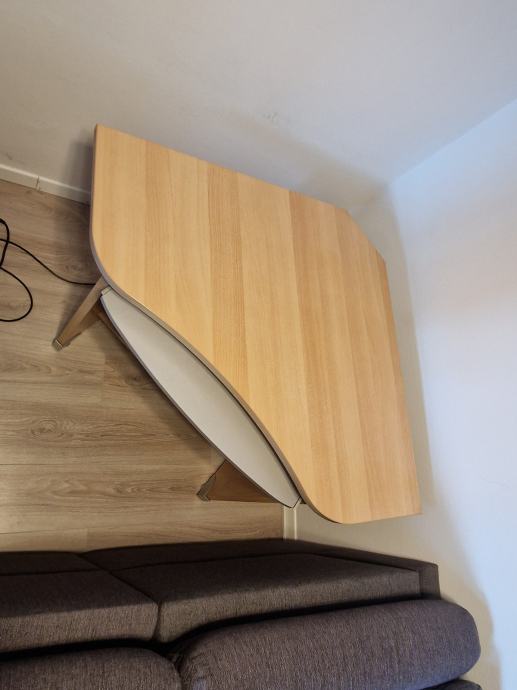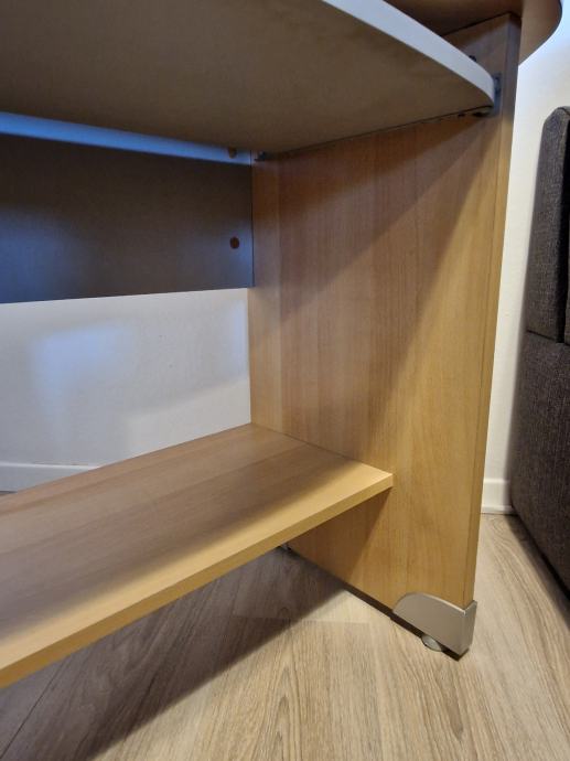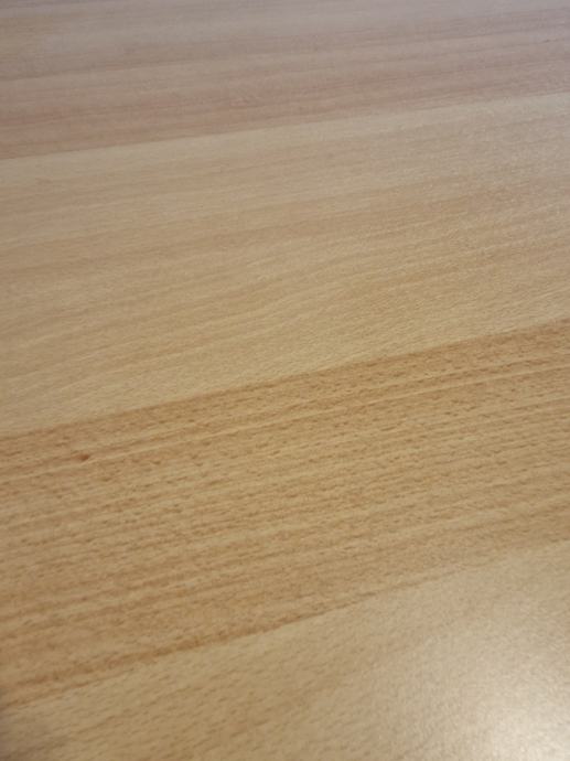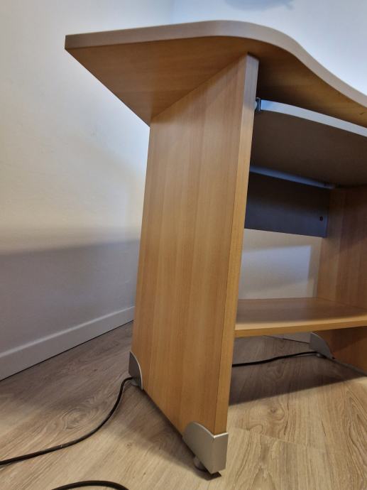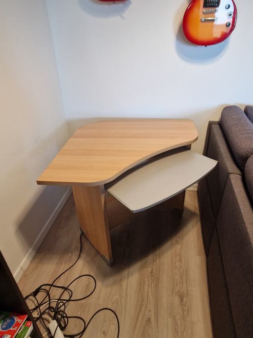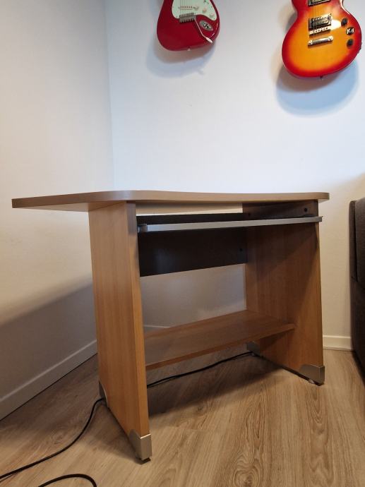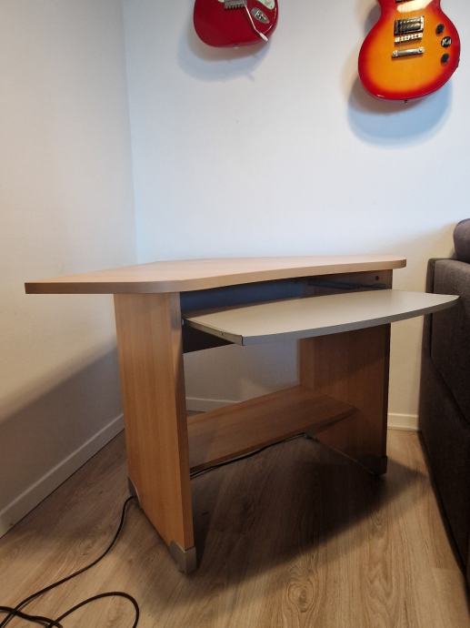 Polica za tipkovnicu ima malo napuhnuće od vlage uz rub vidljivo na drugoj slici, osim toga stol je neoštećen.